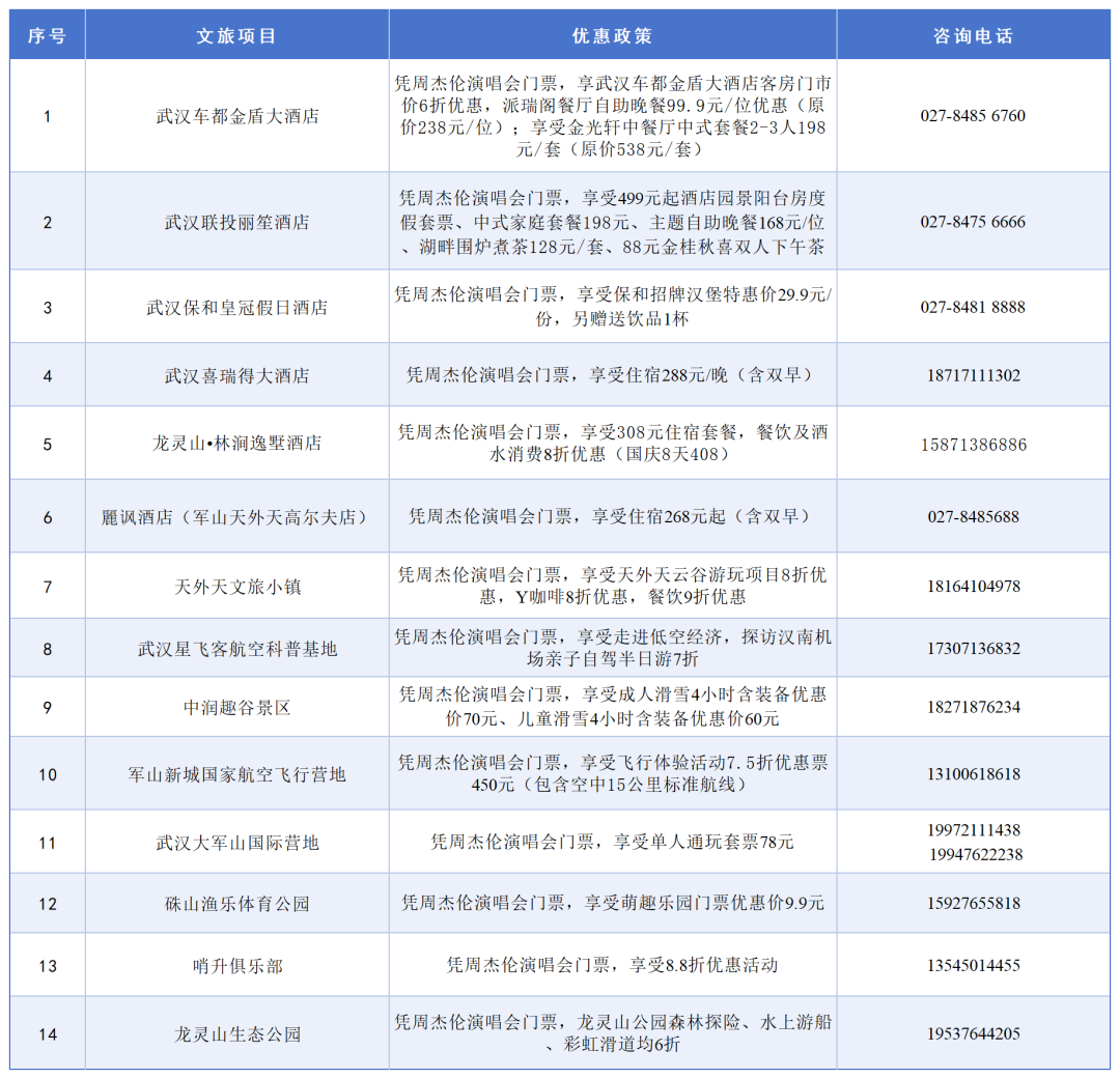 凭演唱会门票票根或购买凭证还可享受武汉经开区多项文旅福利,包含区内多个酒店和热门景区优惠。