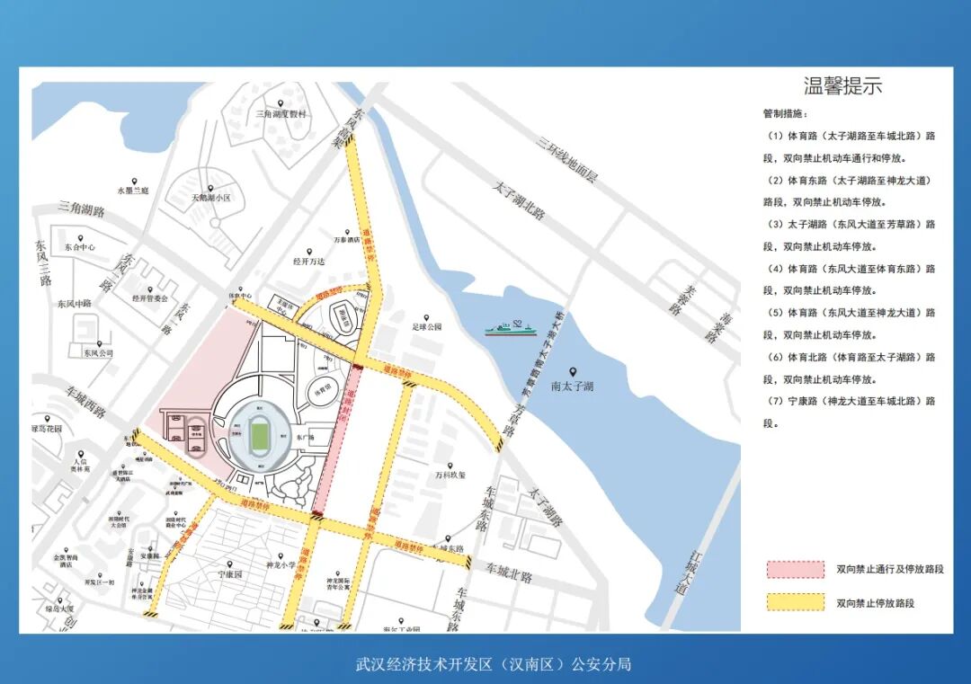 体育中心周边东风大道(太子湖北路至神龙大道)、体育路、车城北路、太子湖路、体育东路、宁康路禁止大型货车通行。