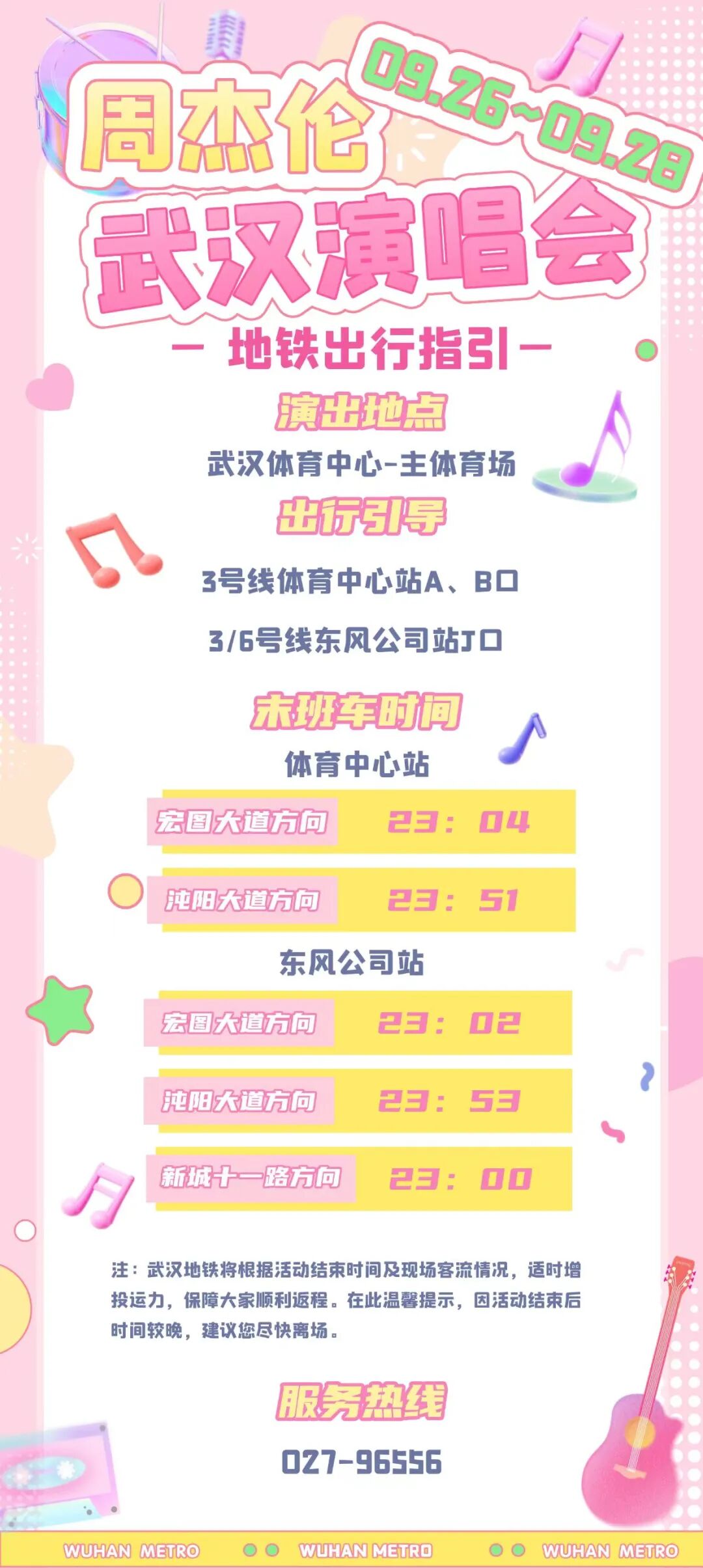由于演唱会当天周边道路交通临时管控,交通压力巨大,建议自驾前往武汉体育中心的观众,将车辆停放在“武汉杉杉奥特莱斯”(停车位约1800个,提供购物、餐饮)、永旺梦乐城(停车位约4000个,提供购物、餐饮),然后转乘地铁6号线(江城大道C口进)至东风公司(J口出),共1站路。出地铁站后,步行前往武汉体育中心3号门(看台)、4号门(内场)、5号门(看台)检票口(约5-10分钟)。观看演唱会结束后,可原路返乘6号线从东风公司站(J口进)至江城大道(C口出),步行前往“武汉杉杉奥特莱斯”取车。