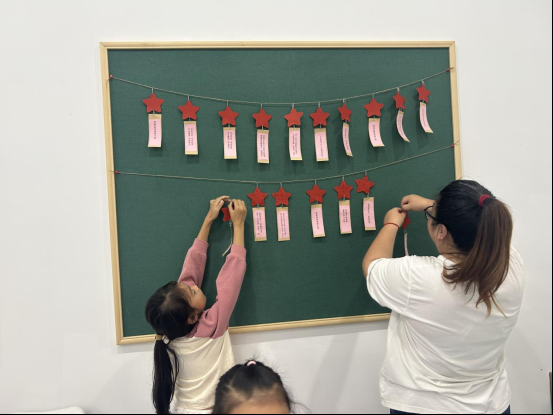 本次活动特别设计“手绘国庆祝福卡片”实践环节。每位孩子都收到了一张图画式的“爱国小行动”卡片,引导他们从身边小事做起,如爱护国旗、与小伙伴友好相处等。在家长、老师和社区志愿者们的协助下,孩子们用五彩的画笔和卡纸,认真专注地制作属于自己的寄语卡片。这些祝福卡片搭配上如“少年强则国强”等简短的青春寄语,粘贴在城市书房里,共同筑起一面充满童真色彩的“爱国环创墙”,让爱国的种子在每个人心中悄然绽放。