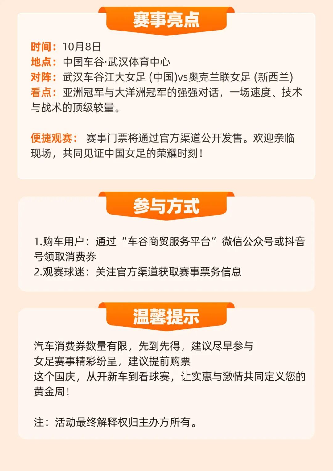 10月3日-10日,中国车谷品牌运营中心汽车消费黄金周全省让利,更有首届国际足联女足冠军杯压轴登场。优惠购车与顶级赛事,点亮您的精彩假期! 首届女足冠军杯购票二维码: 来源:武体集团 编辑:杨雪萍 缑曼 审核:张敏 1