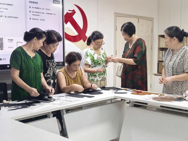 在动手实践环节,居民们兴致勃勃地挑选自己喜爱的皮料和配件,在老师的耐心指导下,开始了一场匠心之旅。大家认真地进行量裁、打磨、缝制,每一个步骤都做得一丝不苟。活动中,居民们互相交流制作心得,年轻学员虚心向老师请教缝制技巧,有经验的居民主动帮助初学者,现场充满互帮互助的温馨氛围。
