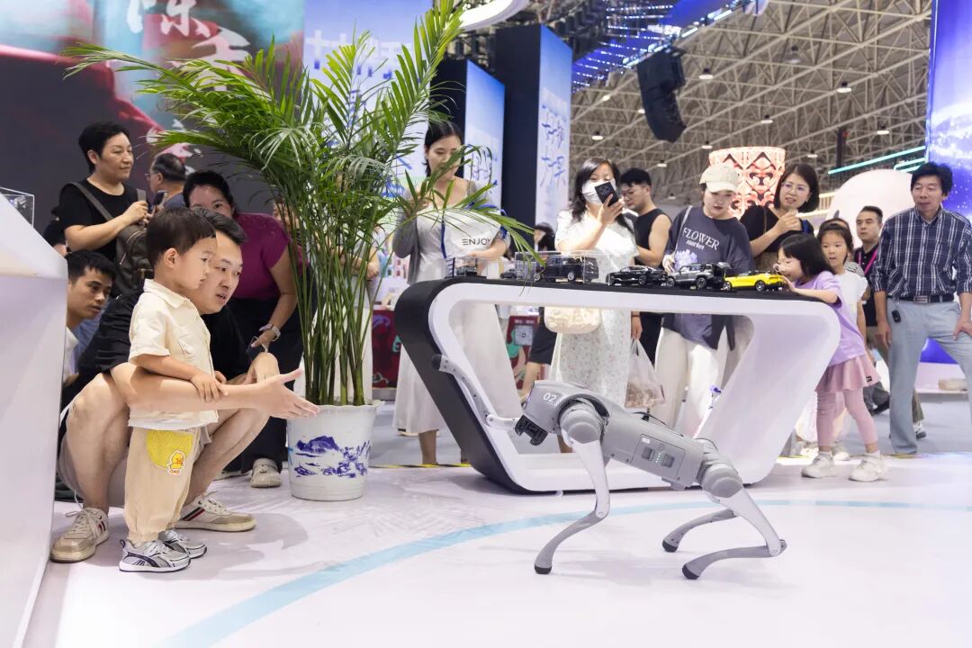 ▲环宇智行研发的四足机器狗正在和小朋友互动。