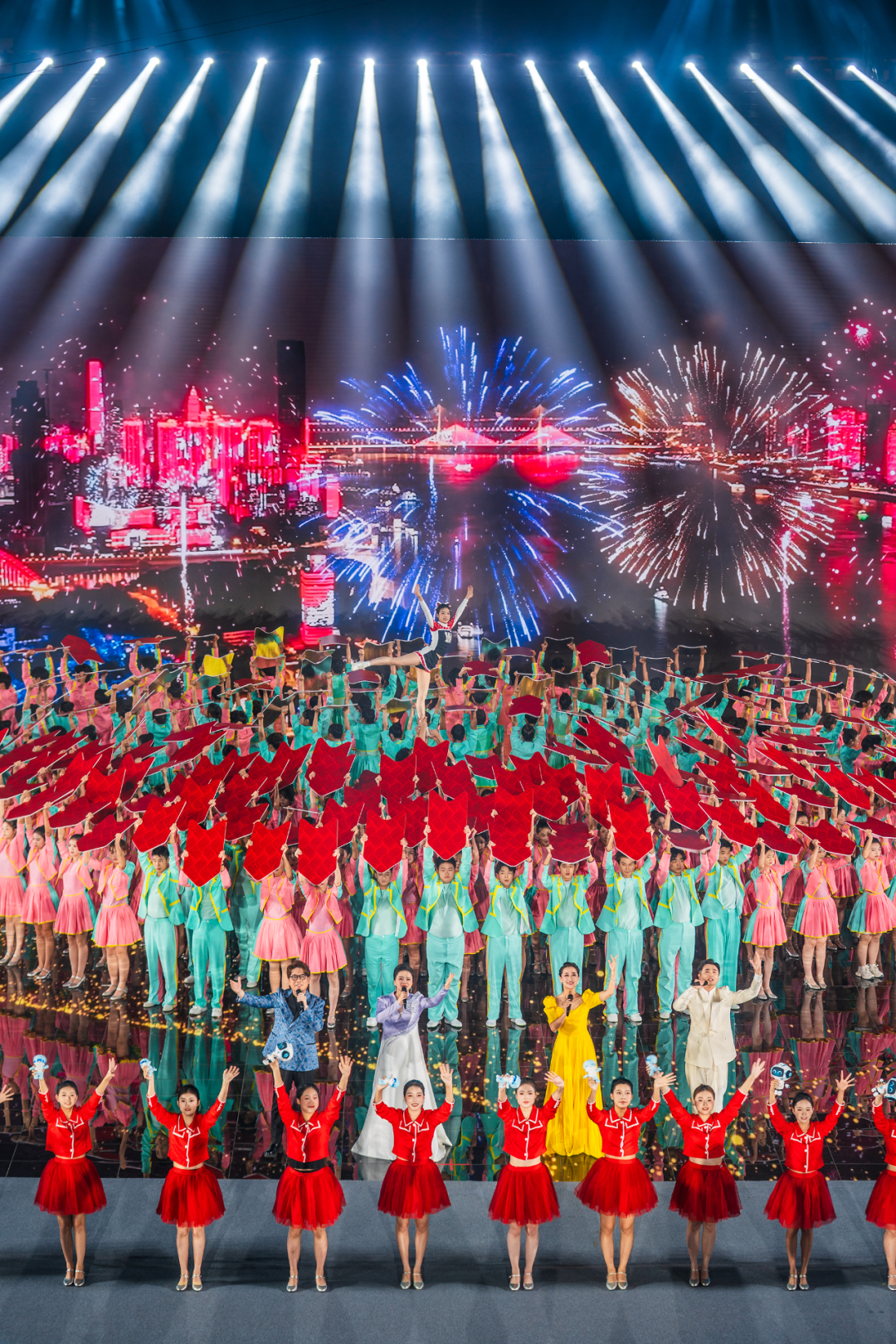 夜幕降临,武汉体育中心外墙灯光渐次点亮,宛若星河倾泻。场馆内,近千名演员在声光电技术的配合下有序排练。整场演出围绕“武汉经开区—武汉体育—武汉市”的发展脉络,紧扣“车”的刚健与“水”的柔美两大意象,通过视觉对比,艺术化再现武汉经开区从“阡陌田园”到“中国车谷”的奋进历程。