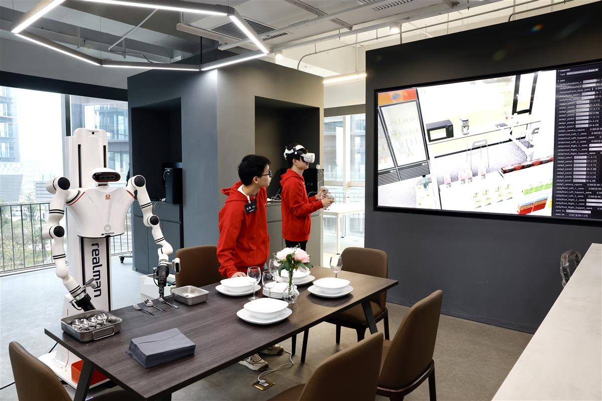 在签约当天的开放体验环节,记者穿戴VR设备进入虚拟世界,亲身引导机器人学习。当记者在虚拟超市从货架上取下饮料时,现实中的机器人立刻“秒懂”,同步完成取物动作;在虚拟卧室,记者叠好被子,机器人随即将被子折成整齐的“豆腐块”。