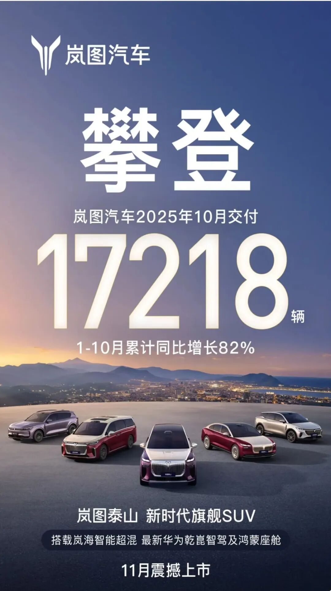 当前,岚图汽车持续完善产品矩阵,不断打造爆款产品。作为岚图全尺寸大六座旗舰车型,岚图泰山11月将正式上市,剑指50万级豪华市场;岚图追光L开启预订后市场表现火热,现已全面登陆全国153城500家门店。此外,作为高端MPV市场的“现象级标杆”,岚图梦想家多月蝉联全国新能源MPV销量冠军,稳居细分市场前列;岚图FREE+跻身20-30万元中大型SUV市场前三;全新岚图知音自上市以来,市场反馈热烈,登顶华为系纯电车型销量榜首。