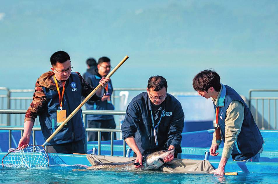 湖北省宜昌市长江珍稀鱼类放流点开展中华鲟保护宣传和增殖放流活动。图为工作人员将中华鲟捞至放流箱内(2024年3月28日摄)伍志尊摄/本刊
