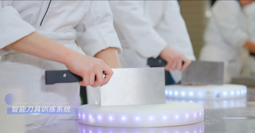 刀工训练区,学生手持搭载传感器的智能刀具专注切丝,砧板实时捕捉下刀角度、频率等多项指标,屏幕即刻弹出精准反馈:“手腕发力偏轻,切丝粗细偏差0.3毫米”。这套师生自主研发的智能刀工训练系统,不仅是《中式烹调基本功训练》的标配,更已形成成熟产品将向全国技能学校推广。