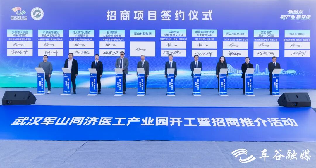 活动上,武汉经开区与同济医院签订院地战略合作协议,双方将携手打造区域医疗服务新高地,助力武汉经开区城市功能品质提升、产业升级。军山科投集团与湖北联投东湖高新集团签订合作协议,法睿兰达智能机器人、柏视医疗AI医疗诊断、华钛新材钛合金医工材料、科大讯飞AI医疗大模型、深兰AI医疗、中眸医疗研发及生产基地、洁诺医疗服务中心、多模态大模型机械臂、纽沃脑机等9个招商项目签约落户武汉军山同济医工产业园。