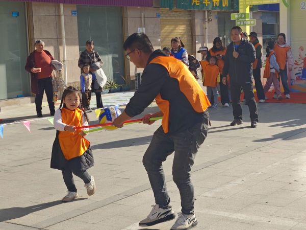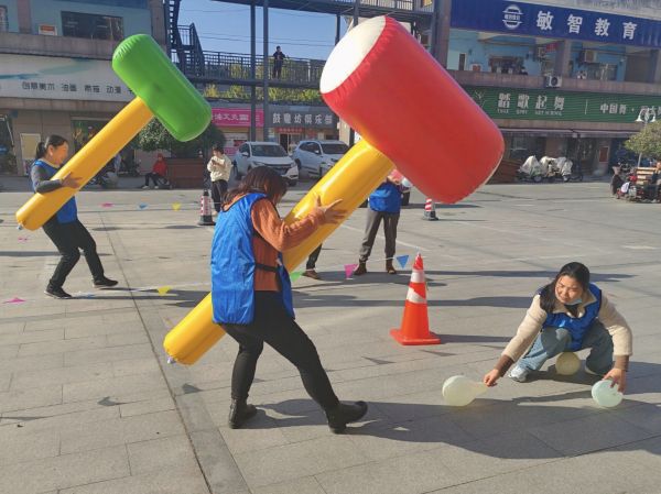 赛场上,各年龄组项目亮点纷呈、趣味十足、加油声欢笑声此起彼伏。亲子互动区温情满溢,“同心协力”项目中,家庭成员双人组队用棍子夹球快速往返,笨拙又默契的“螃蟹步伐”定格温情瞬间;“老虎吃汤圆”项目里,家长精准投球、孩子奋力接球,每一次成功传递都凝聚着亲子间的信任与默契。成人组赛场活力四射,“大锤小用”项目中,充气大摆锤挥起落下,接力锤爆8个气球的挑战让参与者直呼“过瘾”;“齐心协力走”项目里,10人团队步调一致完成30米赛程,充分展现了年轻人的协作精神与蓬勃朝气。老年组的比拼则趣味盎然,“赶鸡入笼”项目中,大家手持蒲扇将充气鸡扇向终点,主持人“不要打!走偏啦!”的俏皮提醒让现场笑声不断、尽显欢乐;“套菜套圈”项目人气爆棚,套中的白菜、萝卜等新鲜蔬菜可直接带回家,让大家在体验运动乐趣的同时收获实用惊喜,参与者们个个喜笑颜开、满载而归。