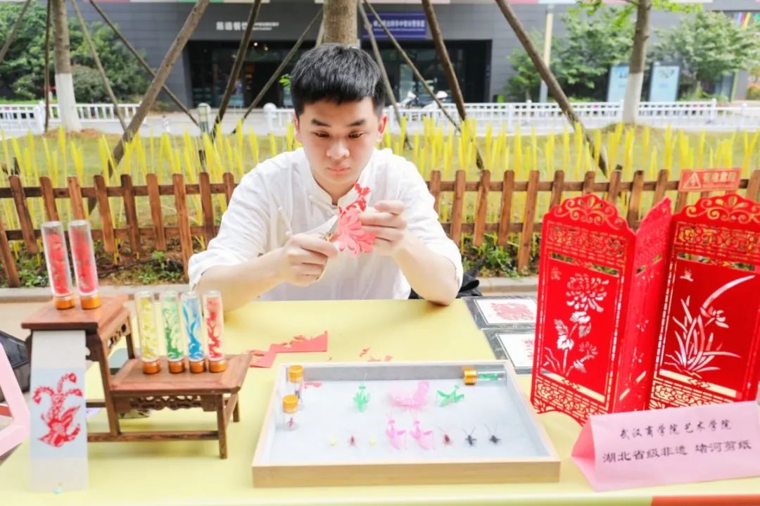 在武汉商学院另一个摊位上,省级非遗堵河剪纸的传承人现场表演剪纸,不到一会,一张张普通的纸变成了灵动的蝴蝶、盛放的花朵。
