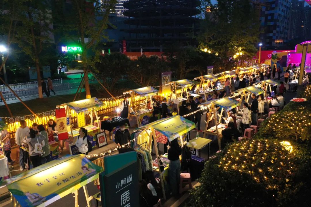 国潮汉服秀、非遗文创、创意手工美物、知音号周边、企业特色产品展……整齐有序的摊位上,摆放着琳琅满目的各色商品,黄昏夜幕之下的市集热闹非凡。