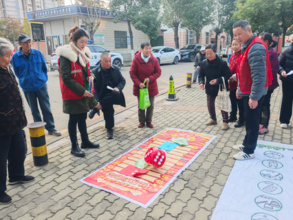 另一边的趣味互动区,俨然成为活动的“人气打卡地”。三个互动游戏点位前热闹非凡、欢声笑语不断:反诈飞行棋游戏中,居民分组掷骰子闯关,在答题前进的趣味过程中牢记反诈知识;垃圾分类跳圈赛上,参与者需跳入对应分类区域,同时认读脚下垃圾类别及相关环保法规卡片,在运动中强化分类意识与法治认知;普法滚滚乐游戏以趣味滚动形式,引导居民在限时挑战中记忆法律关键词,真正实现“游戏中学法、体验中记法”。