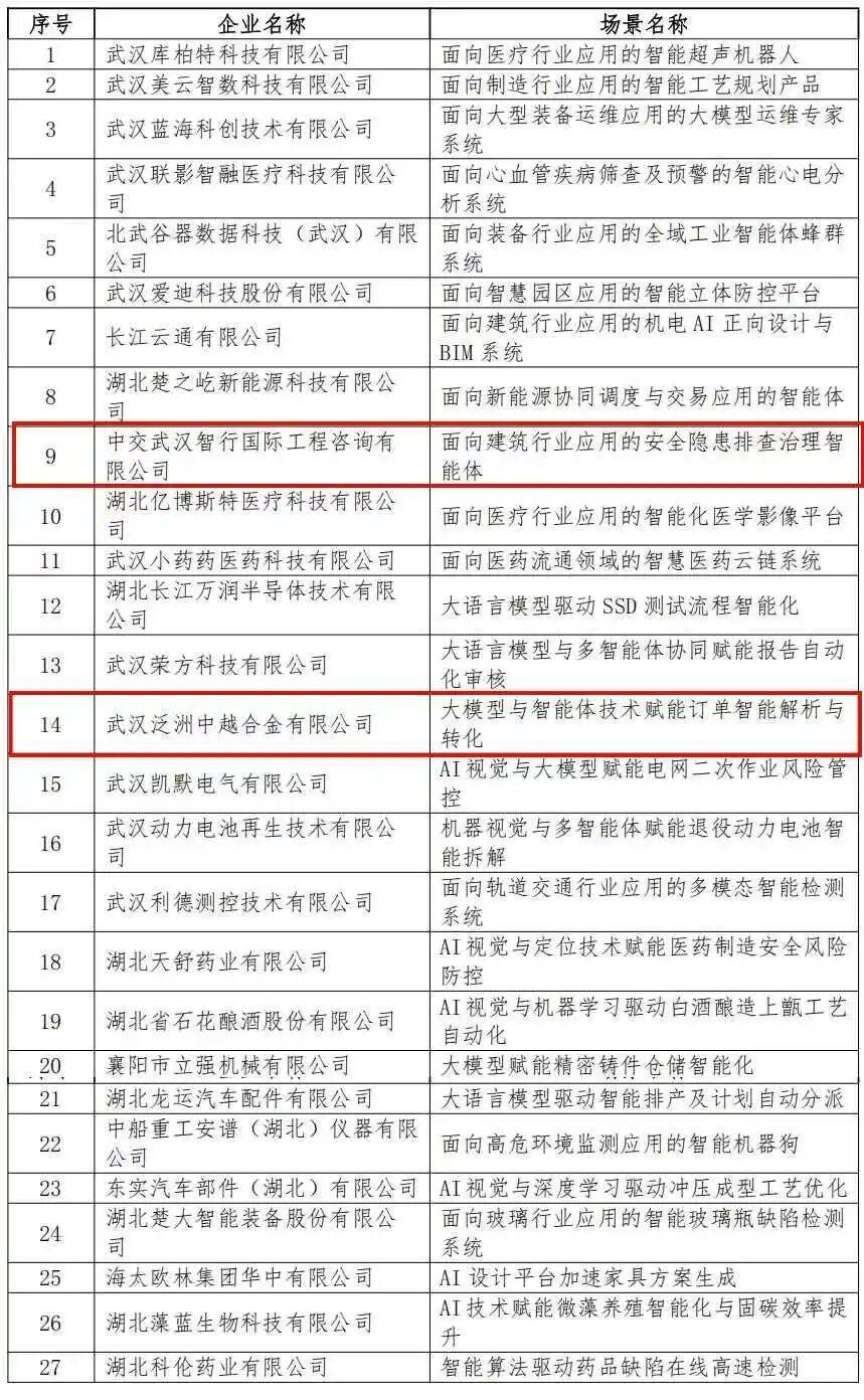 车谷融媒12月14日讯 近日,工业和信息化部在优质中小企业梯度培育平台发布2025年全国中小企业人工智能典型应用场景。武汉经开区2个应用场景入选,分别由区内企业武汉泛洲中越合金有限公司、中交武汉智行国际工程咨询有限公司打造。