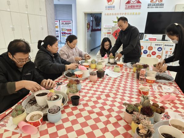 实操环节正式开始,职工们瞬间化身“园艺达人”,兴致勃勃地投入到种植创作中。大家先小心翼翼地挑选心仪的多肉幼苗,随后,按照老师教授的方法,先在花盆底部铺好陶粒增强透气性,再填入营养土,用小铲子挖好坑,将多肉幼苗轻轻放入,调整好位置后压实土壤,最后撒上彩色石子装饰。过程中,大家相互交流技巧,主动分享经验,有的职工还热心帮助新手整理植株,现场欢声笑语不断。经过一个多小时的忙碌,一盆盆造型别致、绿意盎然的多肉盆栽相继完成,职工们捧着自己的“作品”,脸上洋溢着满满的成就感。“平时工作比较忙,很少有时间接触这些,这次活动既放松了心情,又认识了新朋友,特别有意义。”参与活动的职工李佳说道。