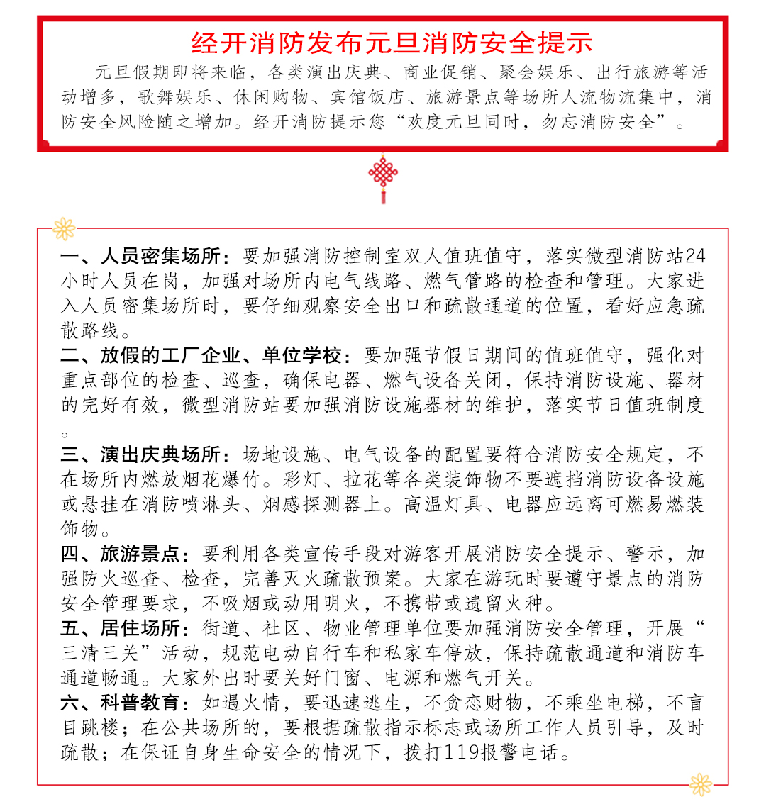 元旦假期即将来临,各类演出庆典、商业促销、聚会娱乐、出行旅游等活动增多,歌舞娱乐、休闲购物、宾馆饭店、旅游景点等场所人流物流集中,消防安全风险随之增加。经开消防提示您“欢度元旦同时,勿忘消防安全”。