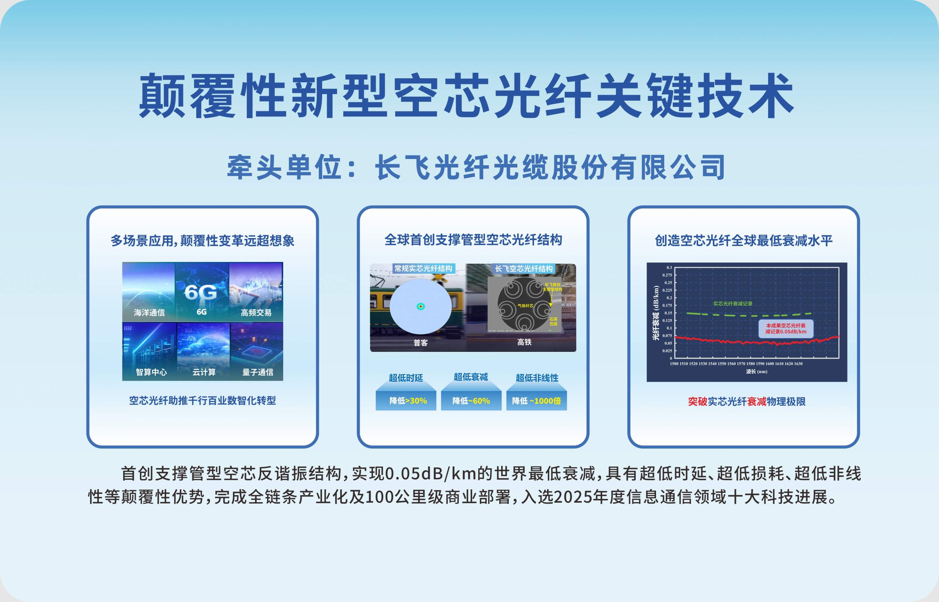 6. 面向AI时代的颠覆性新型空芯光纤关键技术:研制出全球最低衰减的颠覆性空芯光纤。