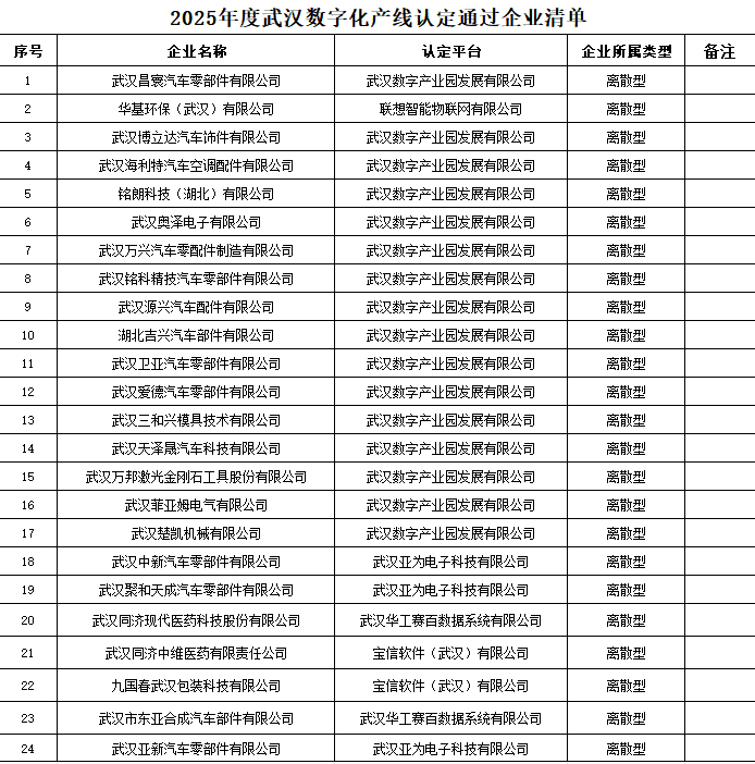 车谷融媒1月9日讯 近日,2025年度武汉市数字化产线认定通过企业名单正式公布,武汉经开区共有24家企业成功入选,获评总数位居全市第一。