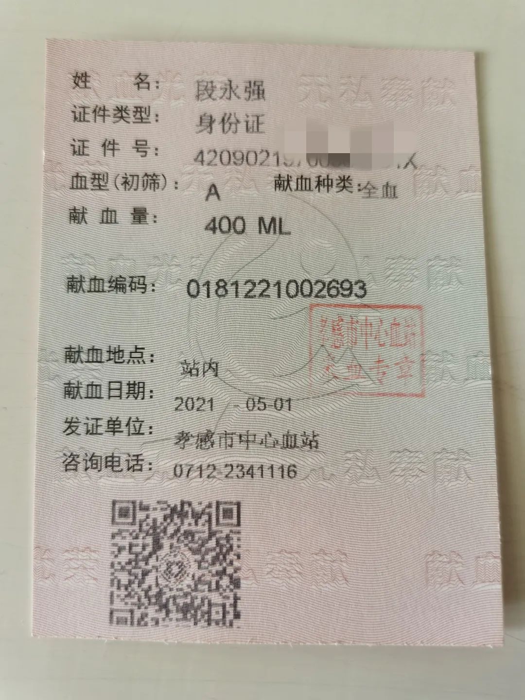 ▲老段的献血证。