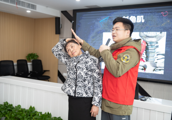 在社区活动室里,刚做完肩颈保健操的独居老人李爷爷笑着说:“以前肩颈疼只知道贴膏药,今天学的几招,浑身都松快了!”这是社区联合武体集团开展的健康服务活动,“八保”志愿队全程参与、贴身服务。他们穿梭在老人中间,手把手纠正动作、耐心解答疑问,既是活动的组织者,更是贴心的“助教”,让健康知识在轻松氛围中落地。