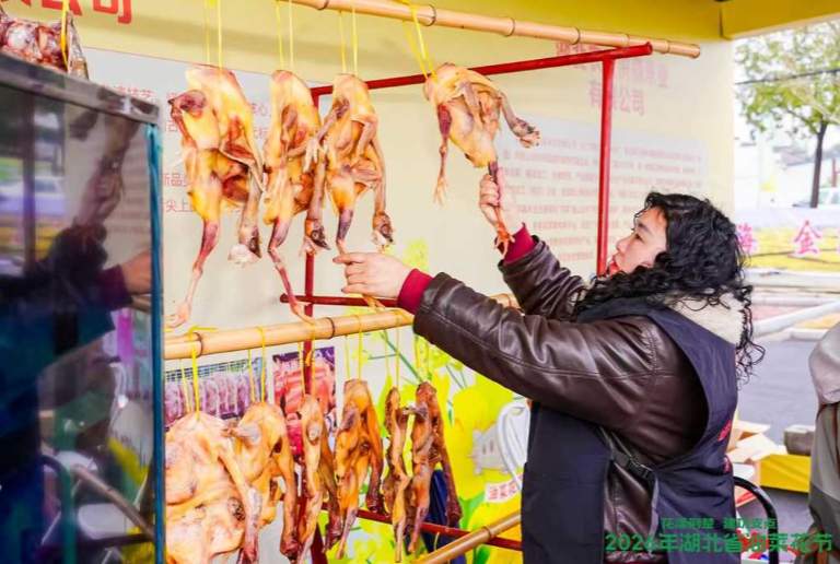 在农产品展销区,色泽金黄的沙洋风干鸡成为游客争相购买的“爆款”。作为传承了1800多年的地方美食,沙洋风干鸡早已不只是刘备与孙夫人的爱情故事,而是形成了实实在在的大产业。