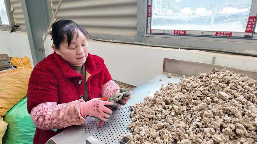 车间另一头,刚刚采摘完羊肚菌的村民们,顾不上歇脚,转身便围坐到加工台上,成堆的苍术,根茎粗壮,等待分拣、去须。大家手不停歇,剪刀咔嚓作响,羊肚菌烘烤的香气与苍术的清冽药香交织弥漫,多元化发展的特色产业让村民四季有事做、月月有钱赚。