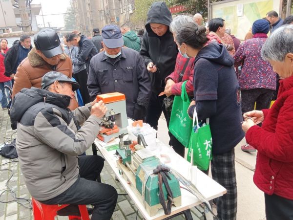 此外,现场还设置生活服务专区。在义剪区,理发师为老人精心修剪发型,剪刀翻飞间传递清爽与暖意;在磨刀、洗锅底摊位前,志愿者们细致打磨每一把刀具、耐心清洗每一口锅具,方便居民日常使用;在配钥匙、义修区,志愿者快速完成钥匙配制,检修雨伞、衣物等物品,及时解决生活“小难题”。