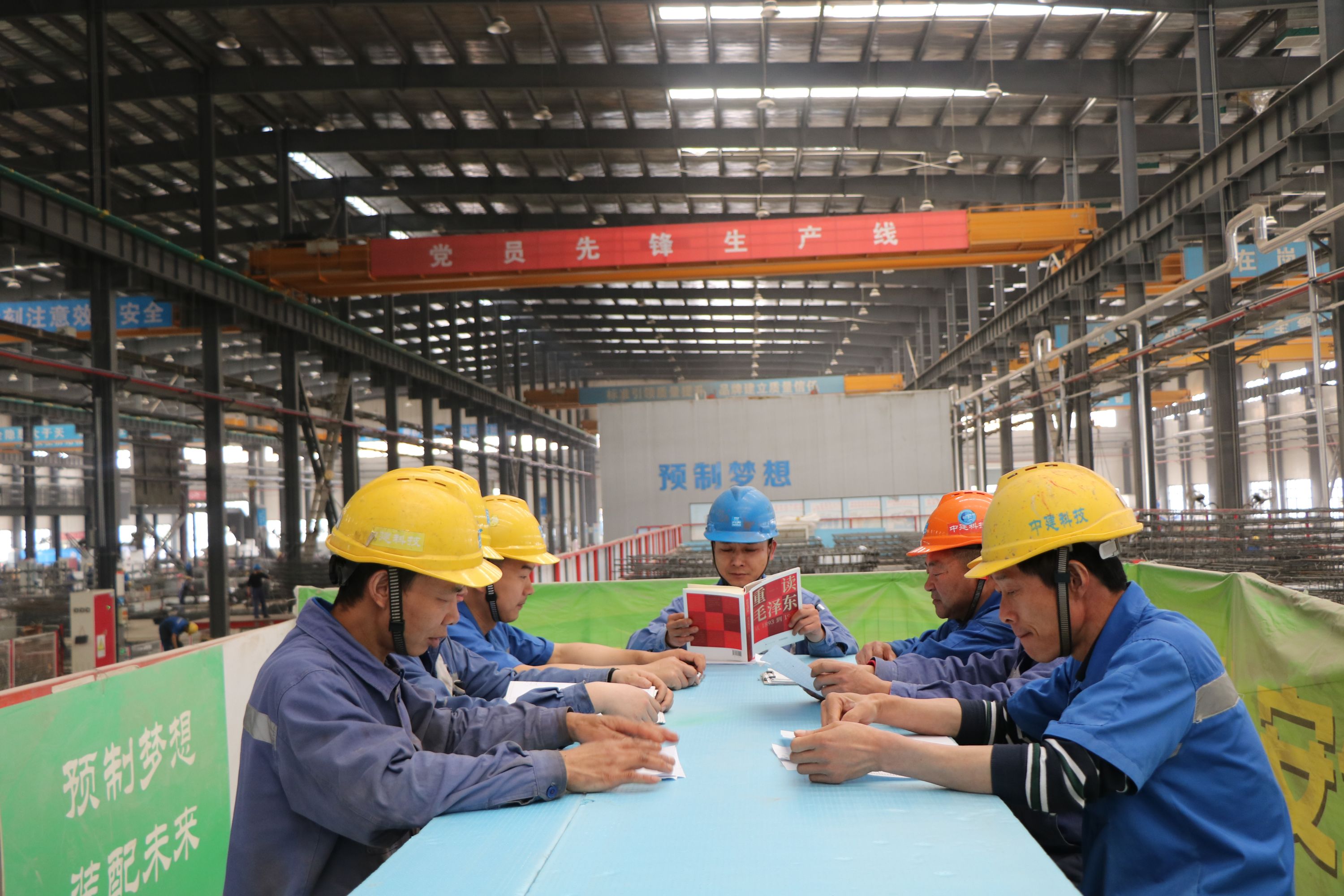 通过管理人员党员与产业工人党员师徒结对,组建党史学习小组,在工厂党员先锋生产线、项目党员先锋模范楼,打造党史学习移动教室和学习广角,利用休息时间,组织产业工人轮流讲读党史书籍。
