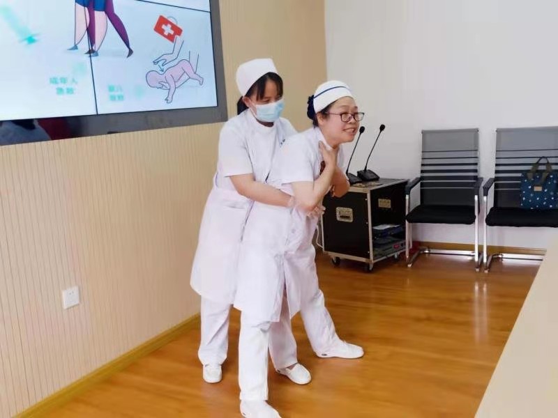 情景演练后,梅桂萍护士还与小朋友们互动演示了实用急救小知识——海姆立克急救法。她表示当有异物卡喉时,该急救法将会发挥巨大作用,抢救生命于一瞬间,让大家多一份急救知识,便少一份伤痛。