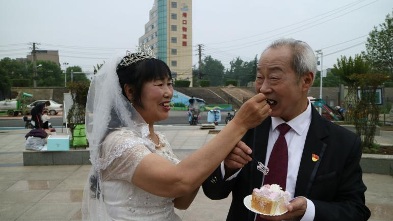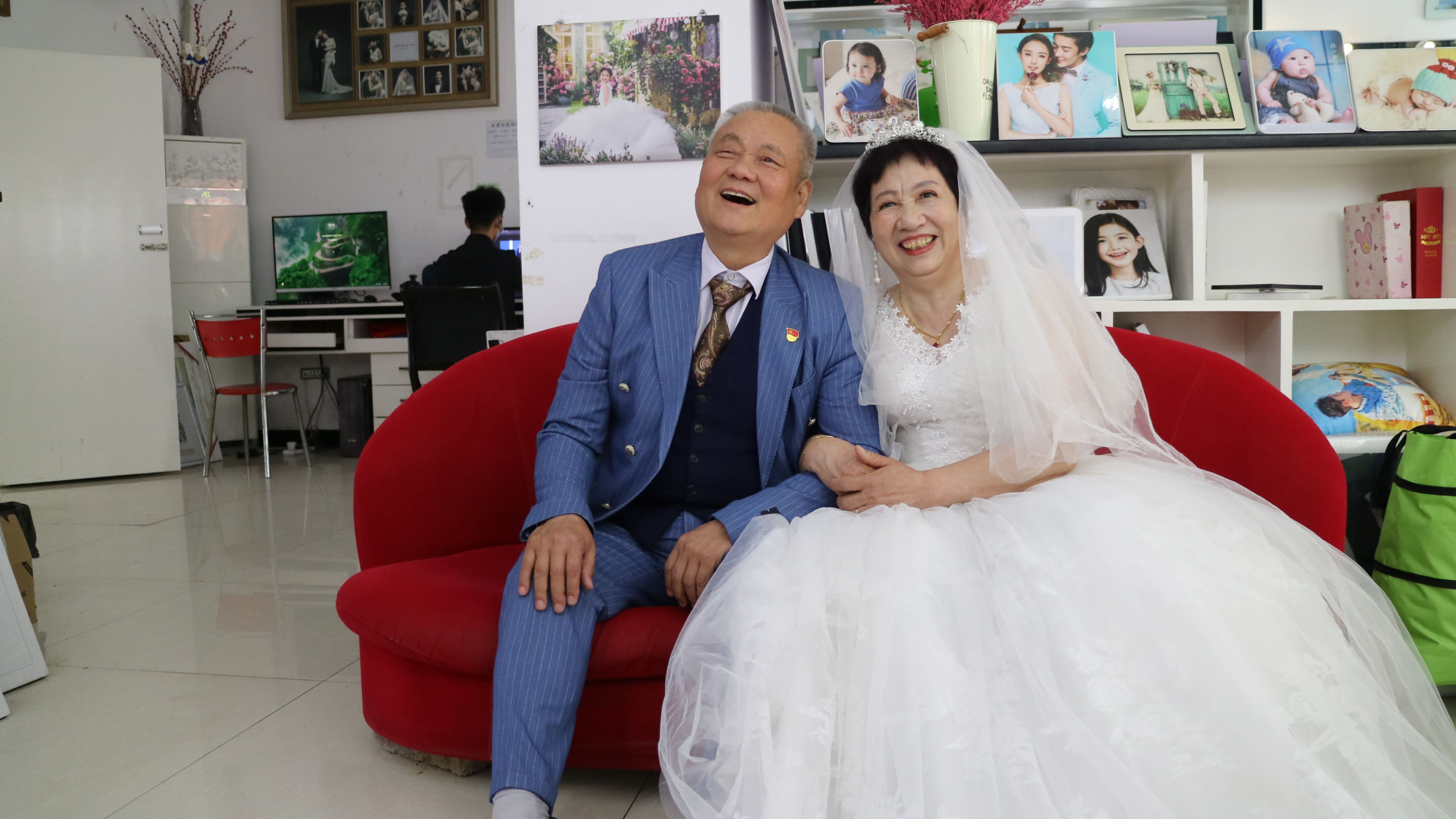 “我们当时结婚就是亲戚送来了自家院里种的蔬菜,摆了三桌,请了亲戚朋友一起吃个饭,就把婚礼给办了,哪有现在的年轻人这么幸福,穿上婚纱,举行隆重的仪式。今年我跟婆婆携手走过了51年,第一次像这样穿的这么隆重,这么正式地拍一次婚纱照。”年近80岁的老党员李爹爹说道。