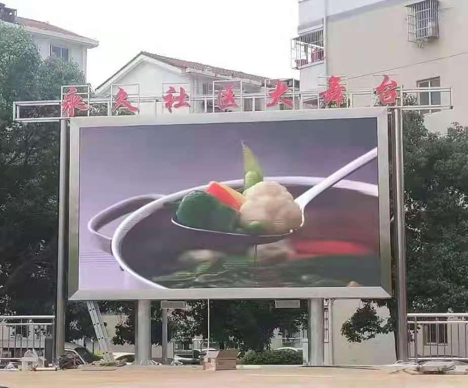 5月24日,永久社区大舞台电子显示屏安装完成,现场吸引了不少群众驻脚观看。