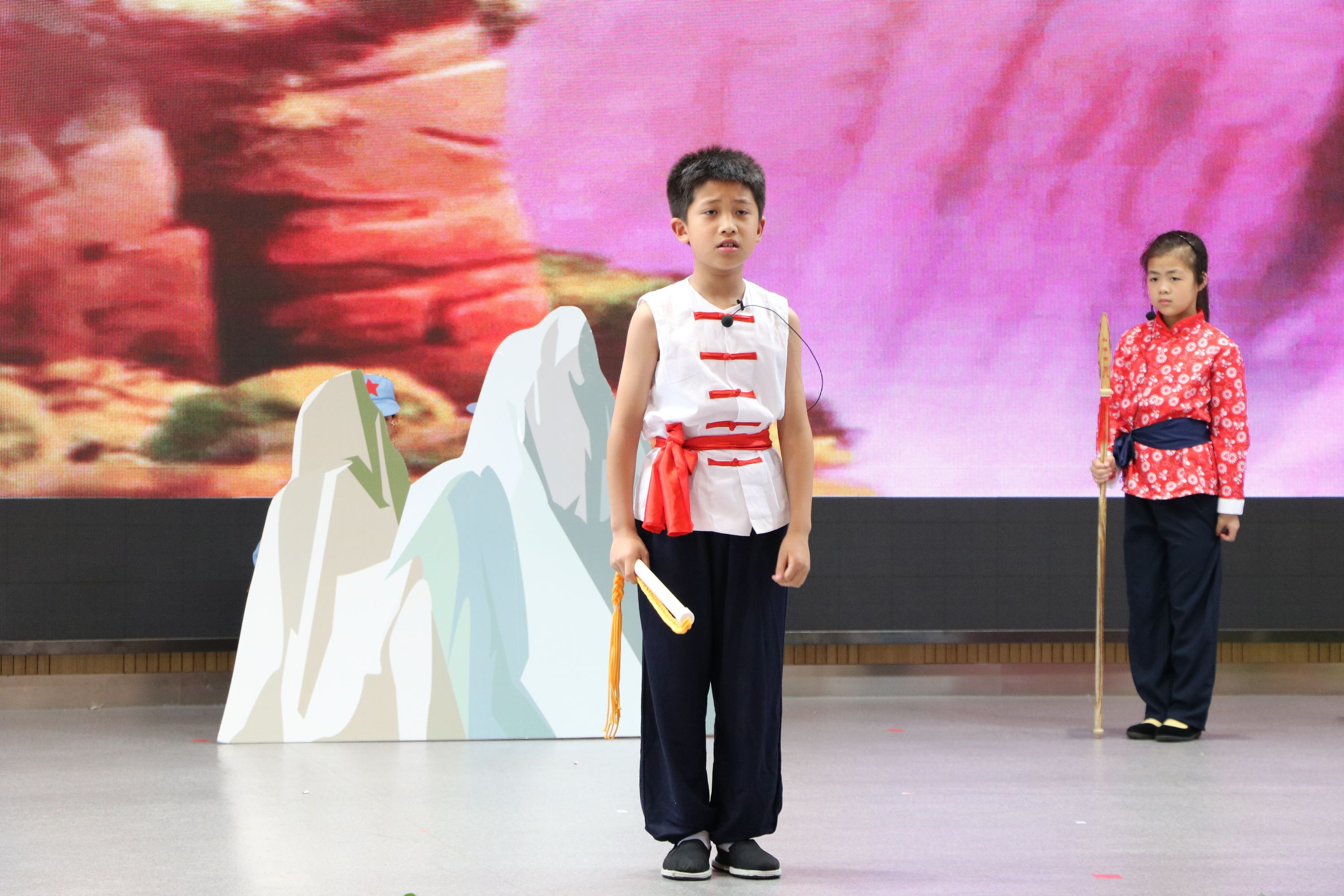 “牛儿还在坡上吃草,放牛的却不知道哪去了……”由该校三年级学生自编自演的课本剧《小英雄王二小》,表演者举手投足都惟妙惟肖,让人眼前一亮,现场观众仿佛置身在那段红色历史中。“王二小生的伟大,死得光荣!一个王二小倒下了,还有千千万万个具有英勇不屈精神的少年儿童。他们像闪亮的红星,照耀着中国大地!”铿锵有力的话音刚落,全场响起热烈的掌声。
