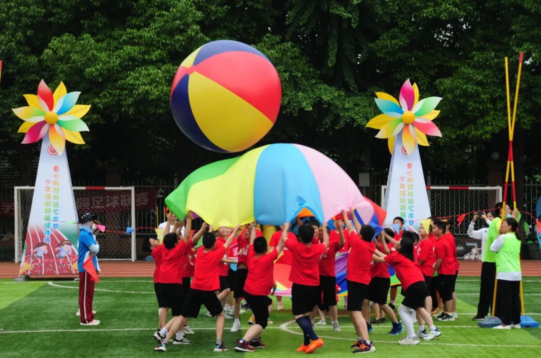 活动现场,全校1700多名学生玩转“毛毛虫”“仰卧传球”“疯狂跳跳球”“抬小猪”“摸爬滚打”等项目,体验运动乐趣,感受合作魅力,收获节日快乐。