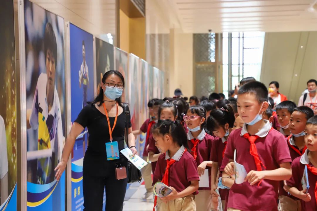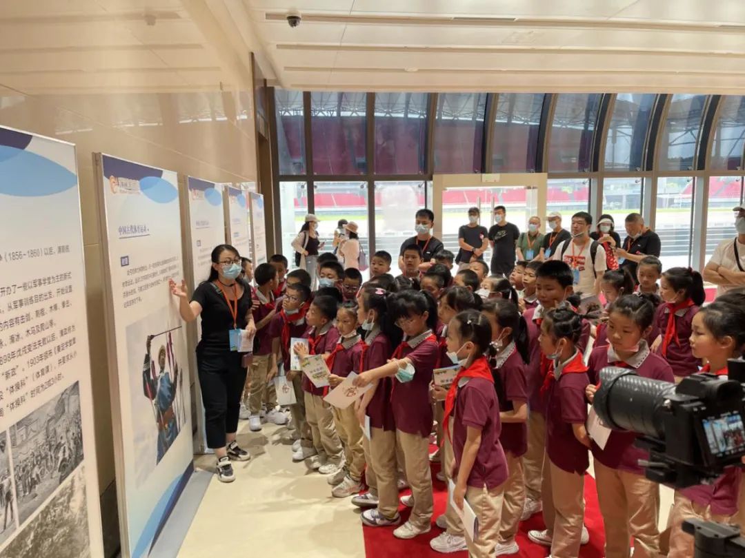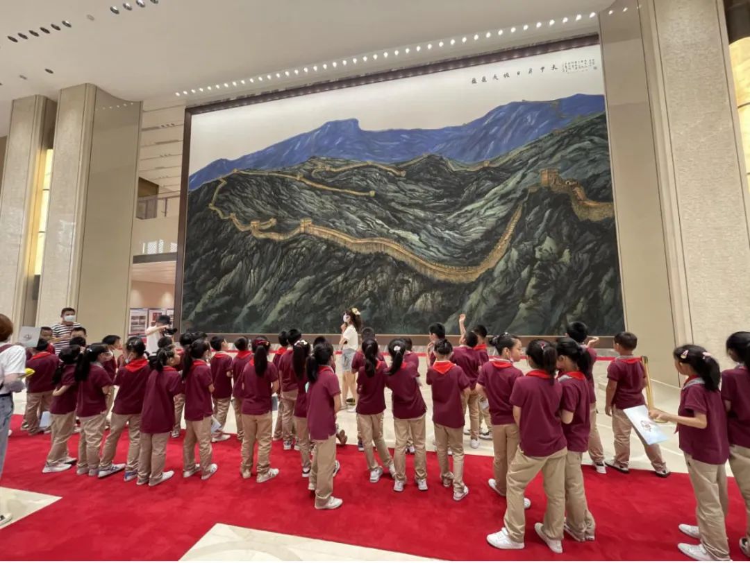 在军运会开幕式的主体育场,孩子们参观了军运主题国画《巍巍长城》、浮雕壁画《沁园春·雪》和《水调歌头·游泳》等,了解中国体育运动和军事运动发展史,重温军运荣光。