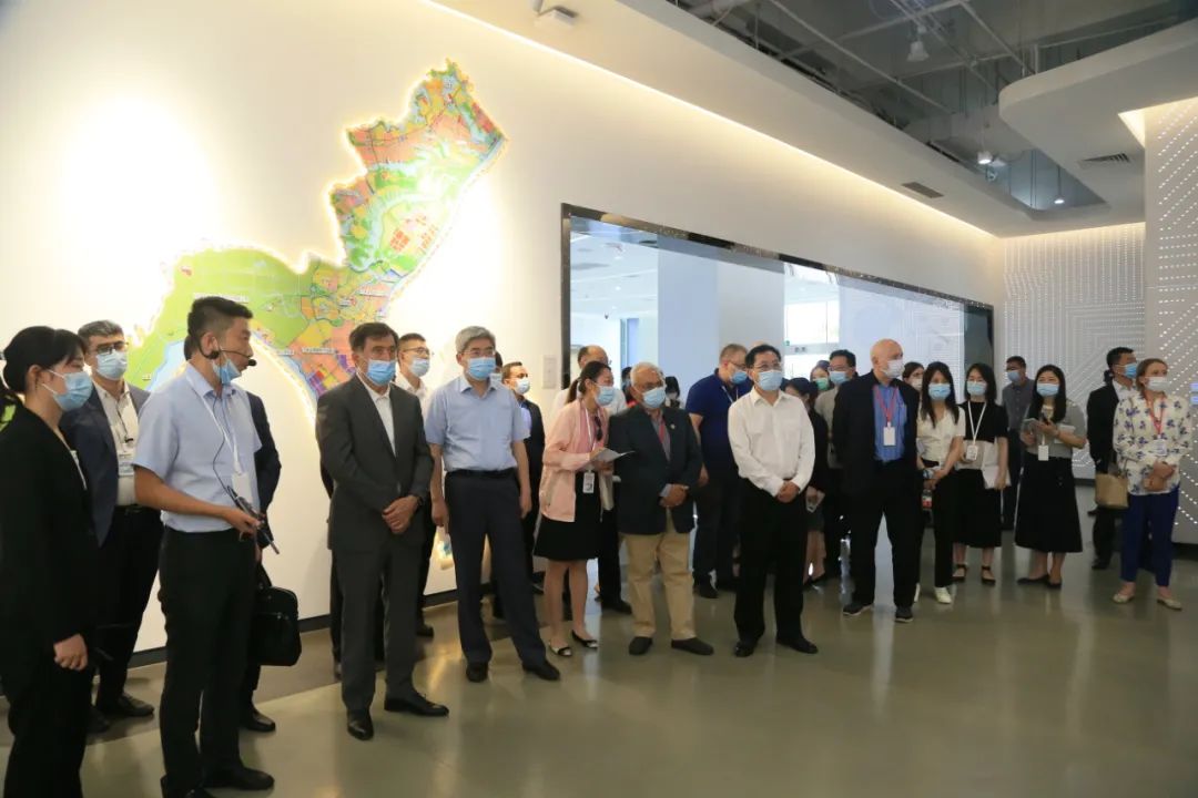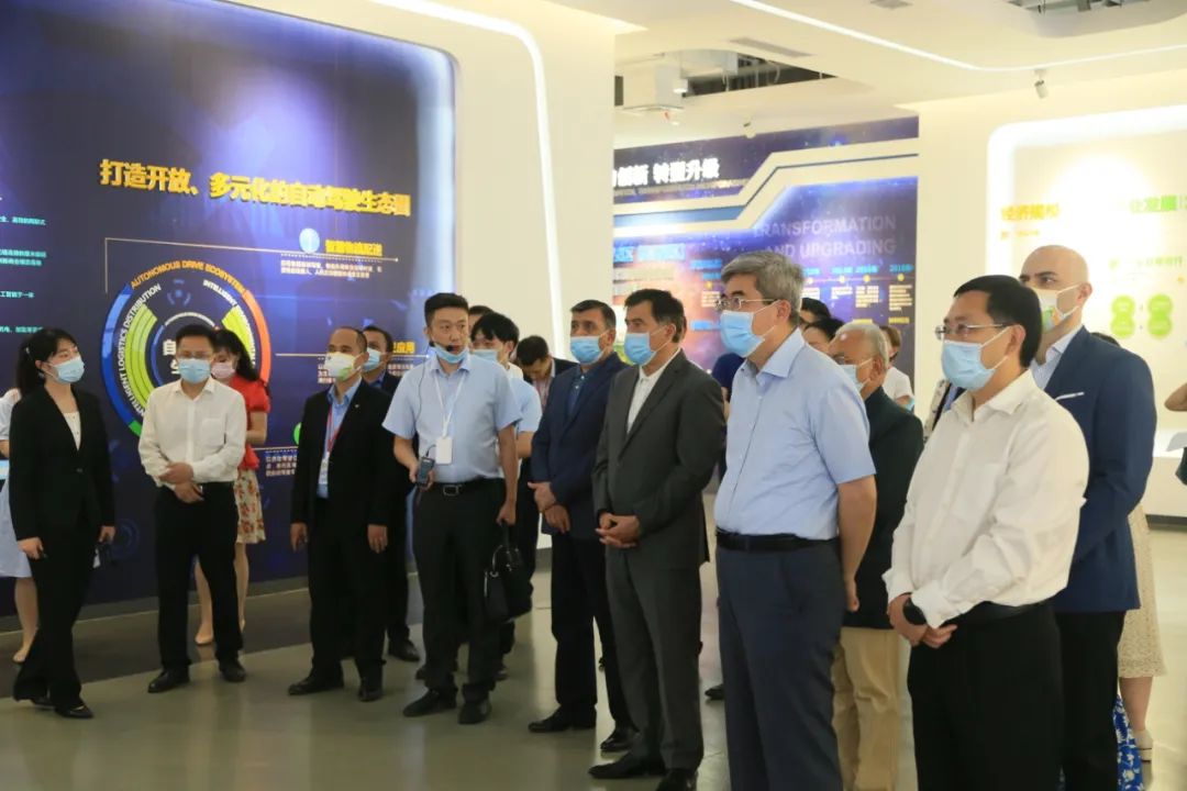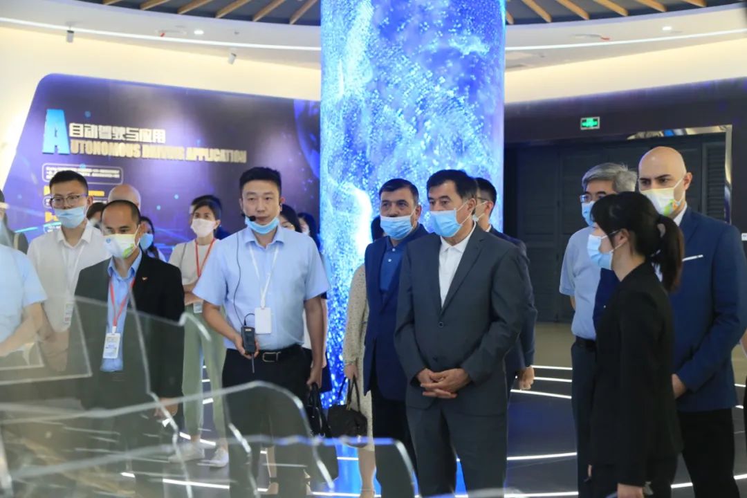 诺罗夫一行走进国家智能网联汽车(武汉)测试示范区展厅,对展区内的开放道路规划、5G基站模型以及智慧道路网等智能网联汽车领域的发展成果进行考察交流。