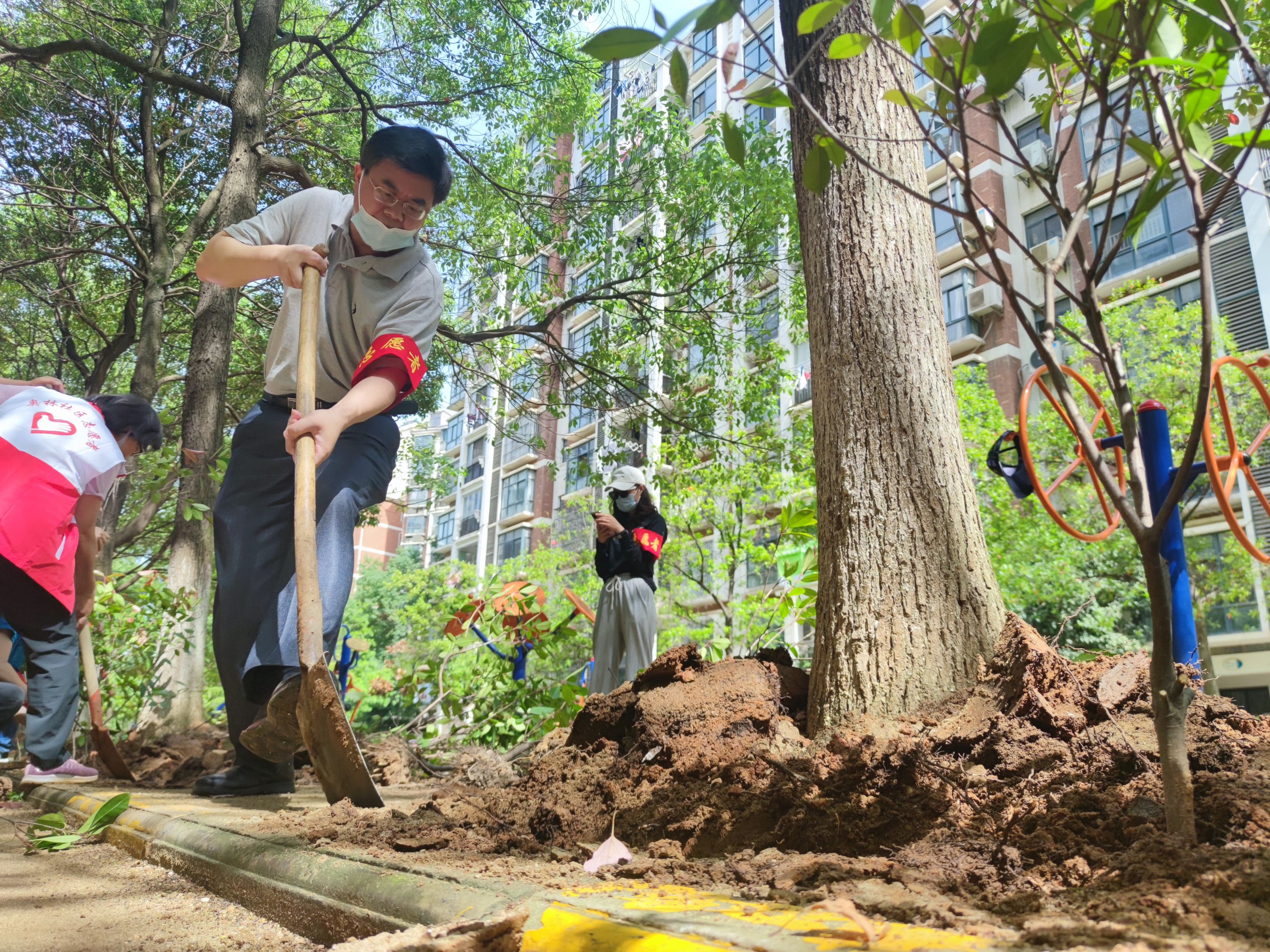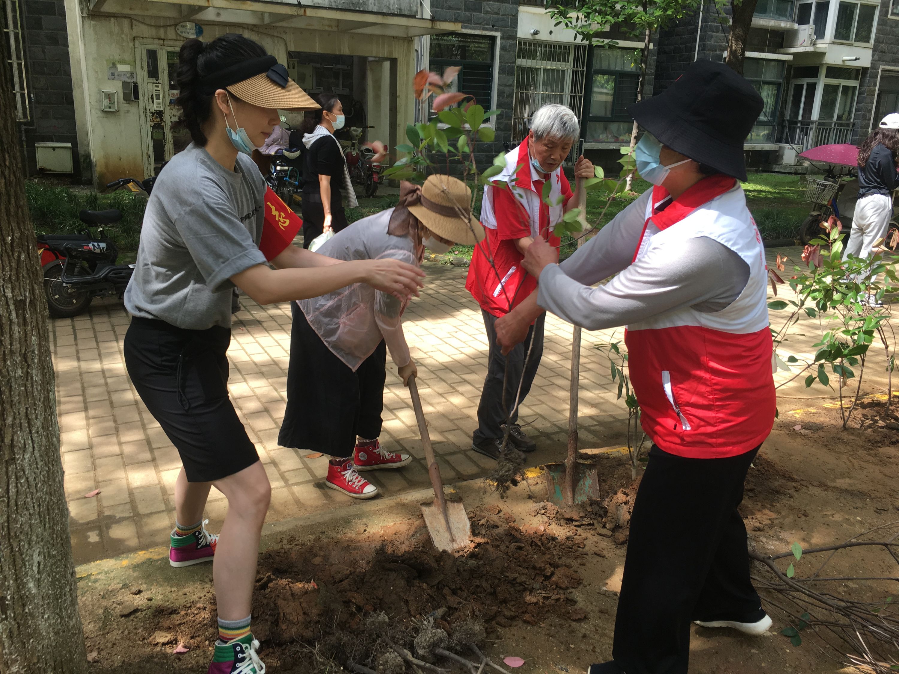 社区工作人员、下沉党员、党员志愿者、物业和群众志愿者纷纷加入到植树现场,干劲十足。