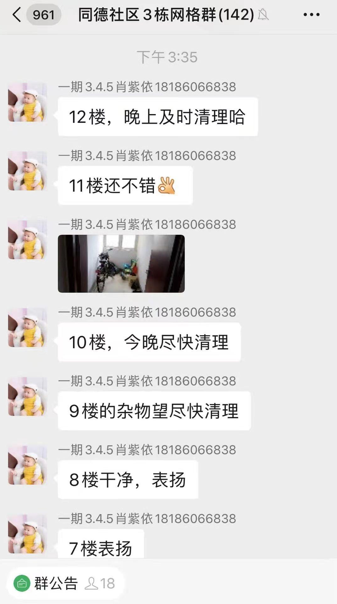 “今天7栋的楼栋门口非常干净,各楼层也没有堆放杂物,值得表扬!”在同德社区的网格群内,这样的点赞每天都有。