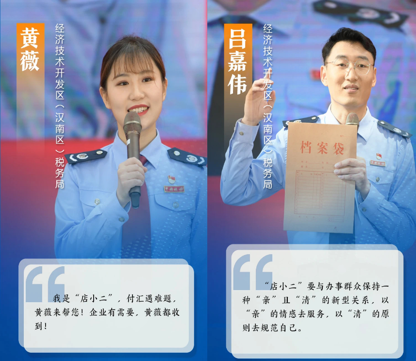 经过激烈的角逐,黄薇、吕嘉伟两位同志脱颖而出,进入决赛,并在决赛中通过政务服务案例分析、知识抢答、即兴演讲等环节,取得领先成绩。