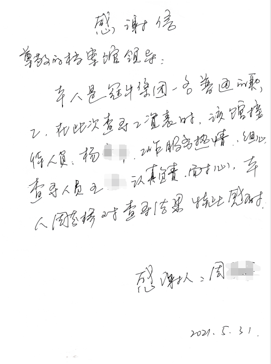 车谷融媒6月9日讯 5月31日,周女士来到区档案馆查档大厅,为工作人员送上了感谢信,信里写道:“档案馆的工作人员服务热情细心,查档人员认真负责耐心,谢谢你们为我找到了工资表。”