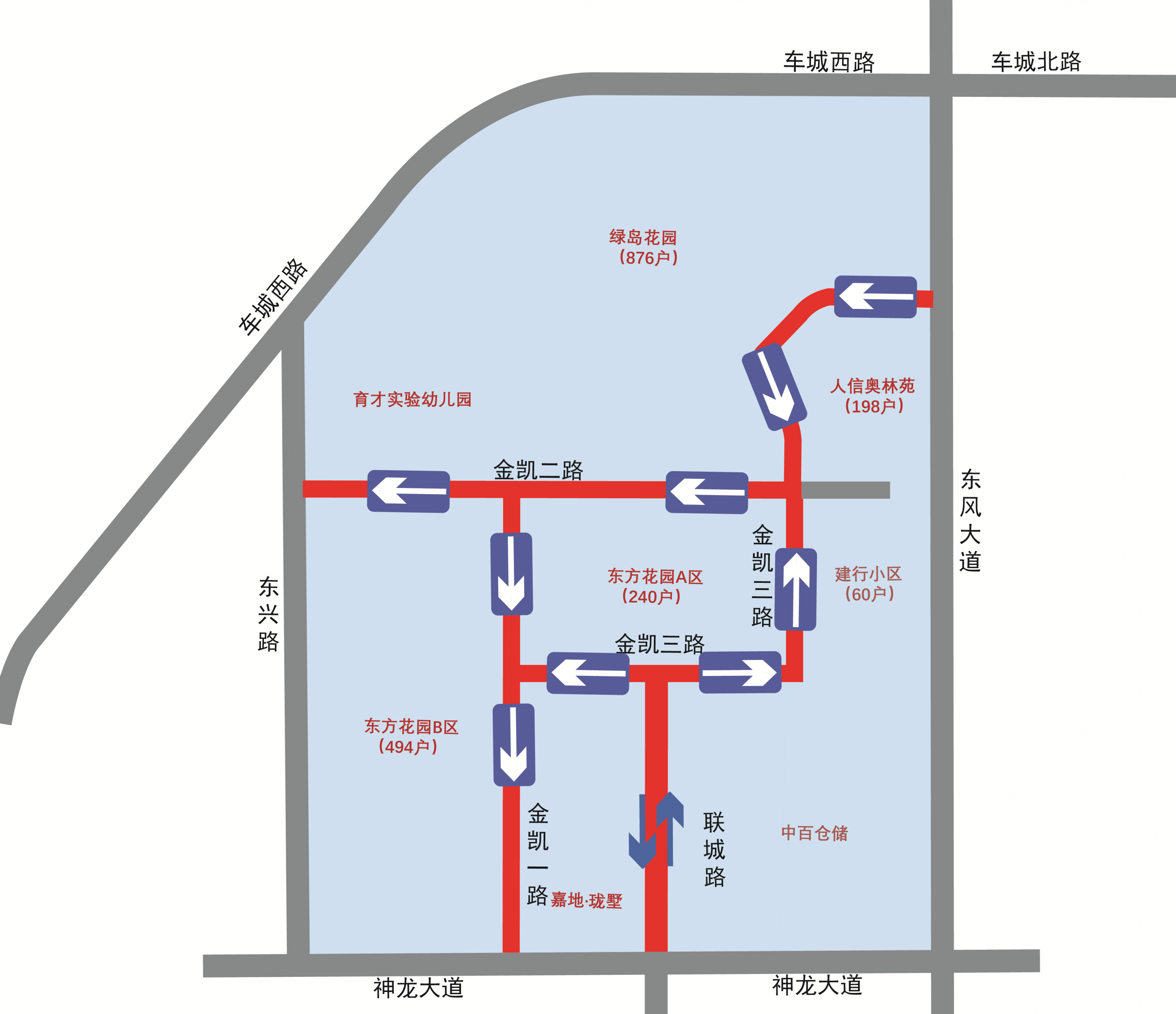 (3)金凯三路(联城路至金凯一路段)允许车辆由东向西单向通行(联城路往金凯一路方向);金凯三路(联城路至金凯二路段)允许车辆由西向北单向通行(联城路往金凯二路方向);金凯三路(东风大道至金凯二路段)允许车辆由东向南单向通行(东风大道往金凯二路方向)。
