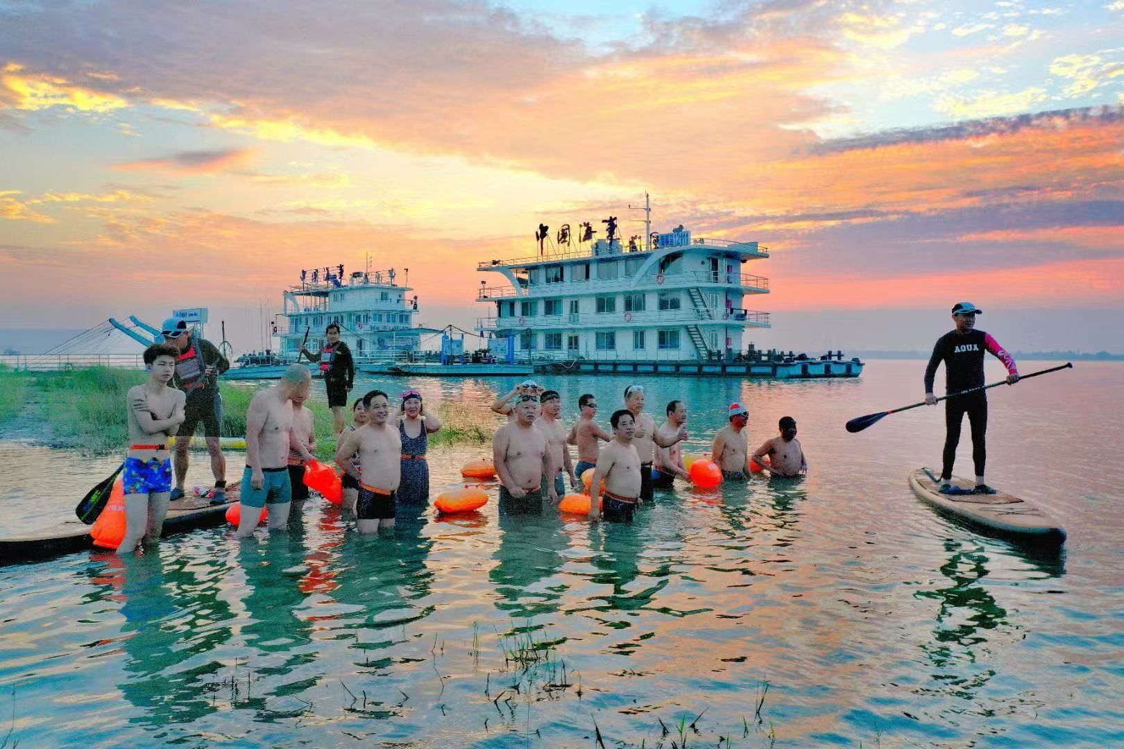 车谷融媒6月24日讯 6月24日早上6点,在武汉经开区(汉南区)纱帽江滩公园长江段,汉南冬泳队二十余名队员迎着朝霞正在开展水上健身晨间训练。