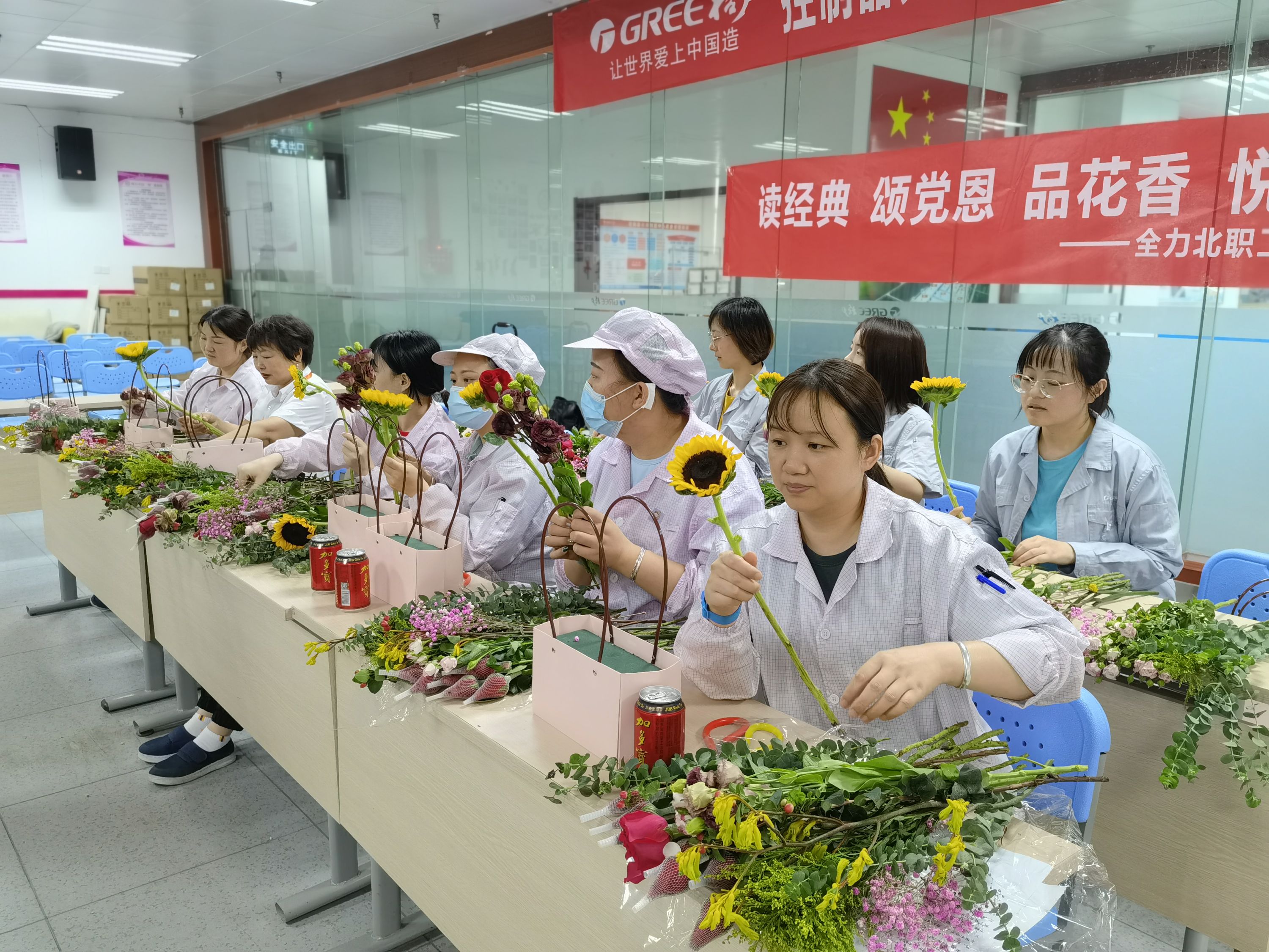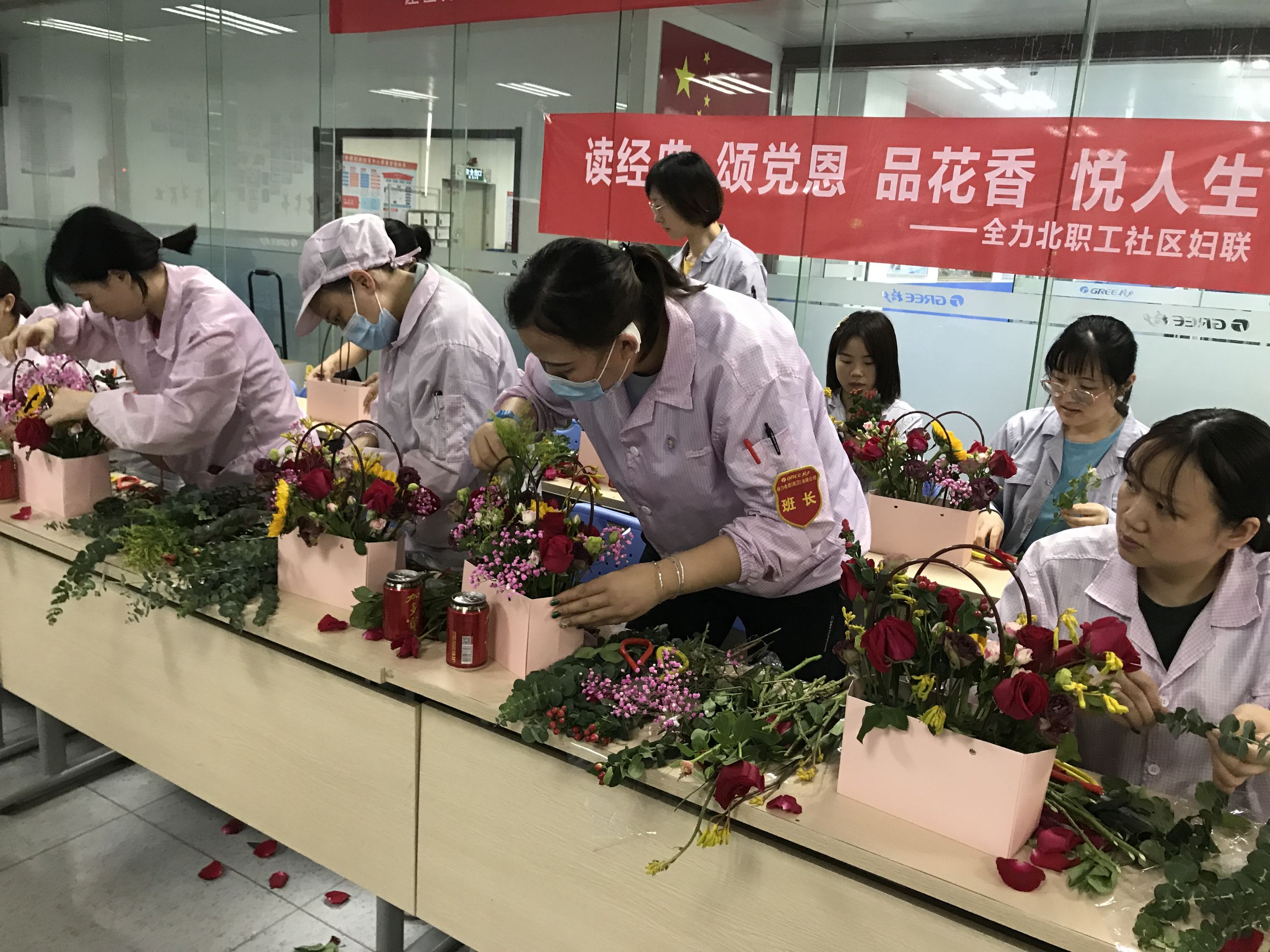 随后,在花艺老师的指导下进行了插花活动。大家跟着老师的节奏,认真学习、发挥想象,一步一步创作着各具特色的插花作品。经过半个多个小时的创作,一篮篮灿烂缤纷、新颖别致的插花作品“新鲜出炉”。
