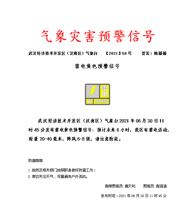 武汉经开区(汉南区)气象局6月30日11时45分发布雷电黄色预警信号:预计未来6小时,全区范围内有雷电活动,雨量20至40毫米,阵风6到8级。