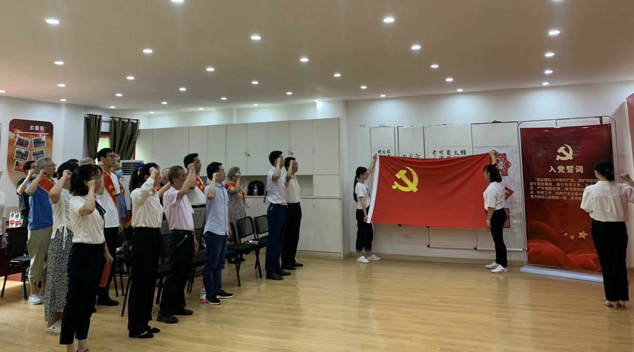 活动现场,全体共产党员坚定地举起右手,面向鲜红的党旗,重温入党誓词。随后区发改局、区统计局、区民政局领导和社区党委书记为11名50年以上党龄老党员代表颁发“光荣在党50年”纪念章。