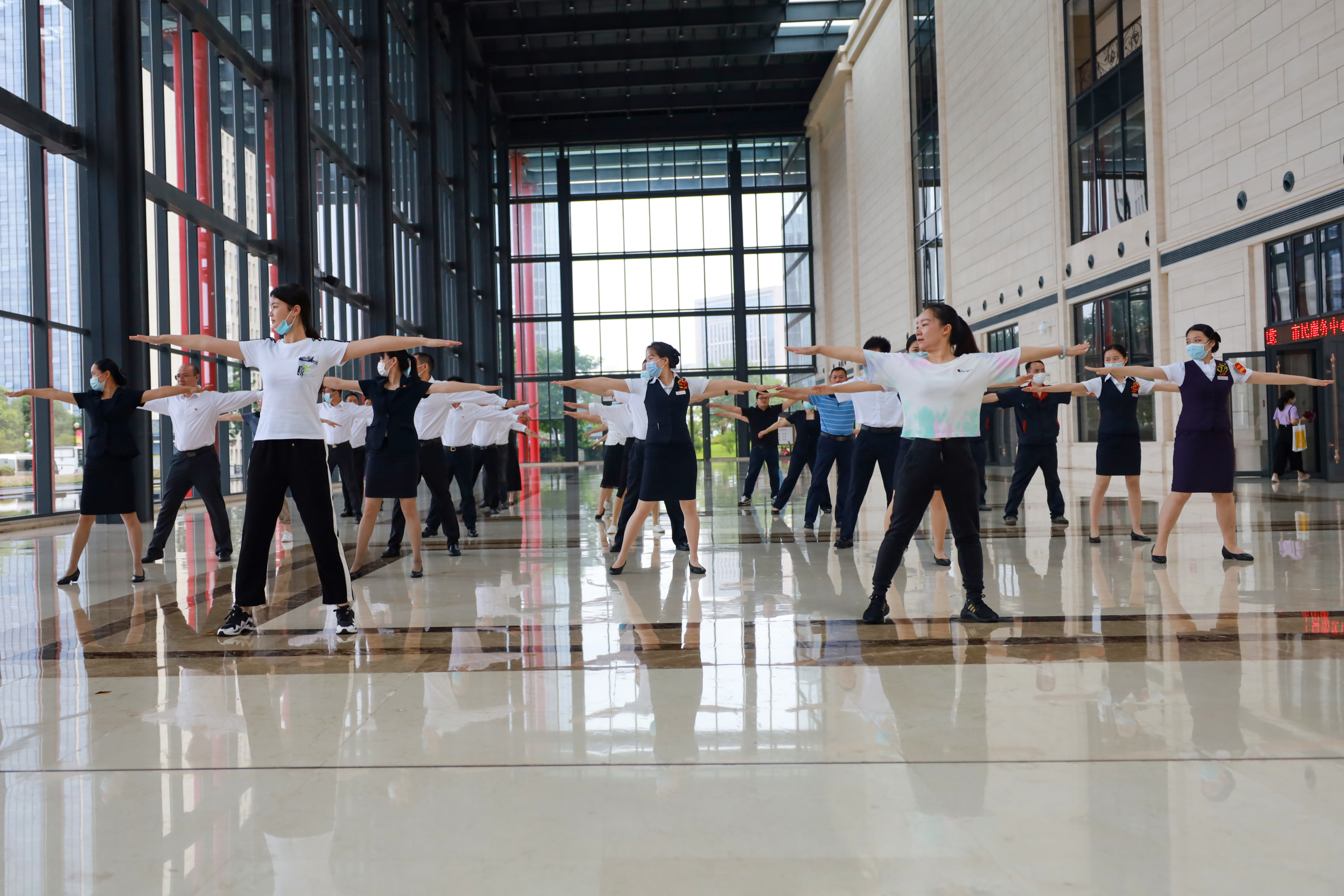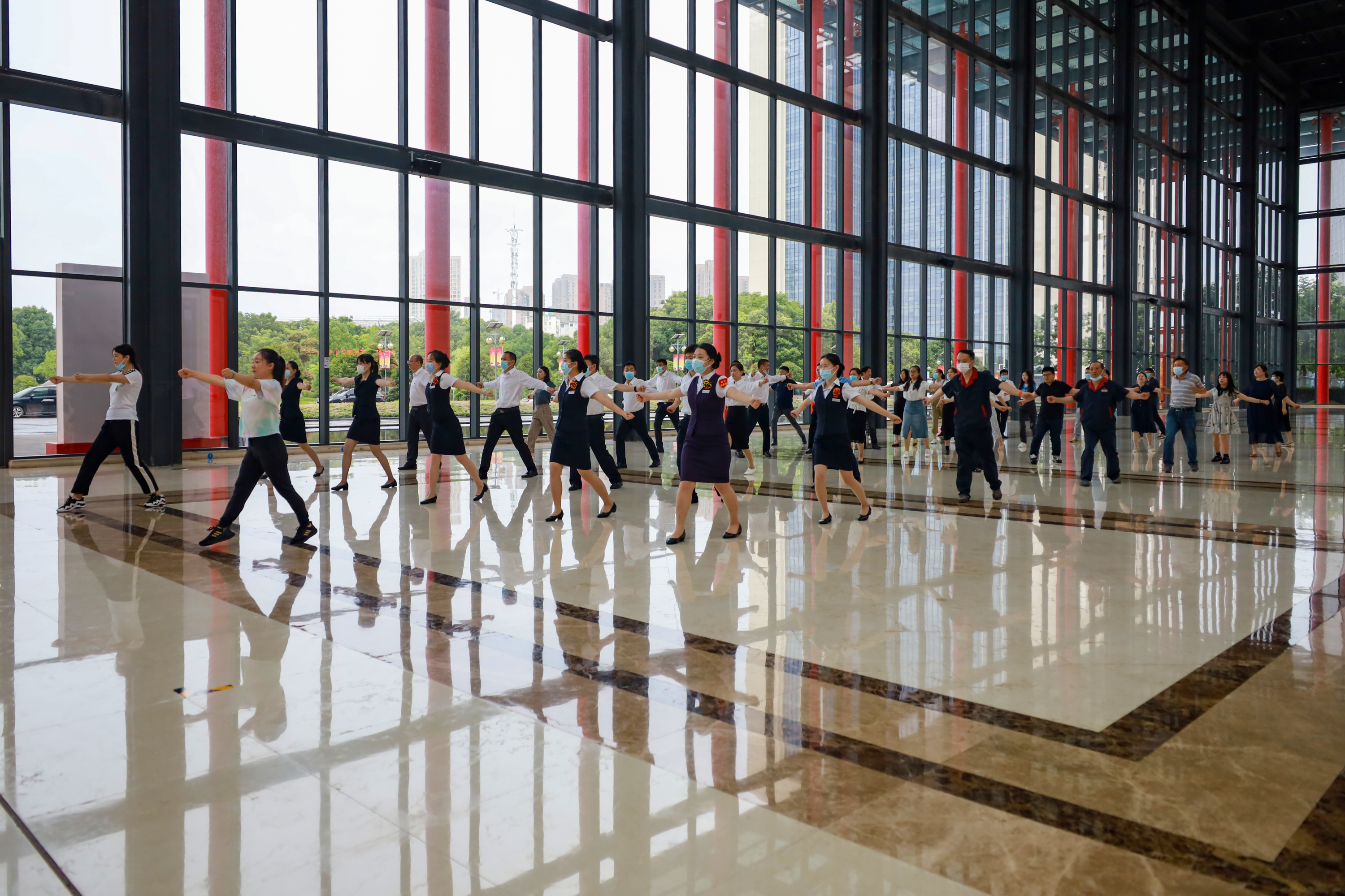 车谷融媒7月1日讯 “第九套广播体操现在开始,原地踏步走……”7月1日上午10点,武汉经开区(汉南区)管委会一楼,伴随着音乐响起,各单位的职工们跟着节拍,认真地做起工间操。