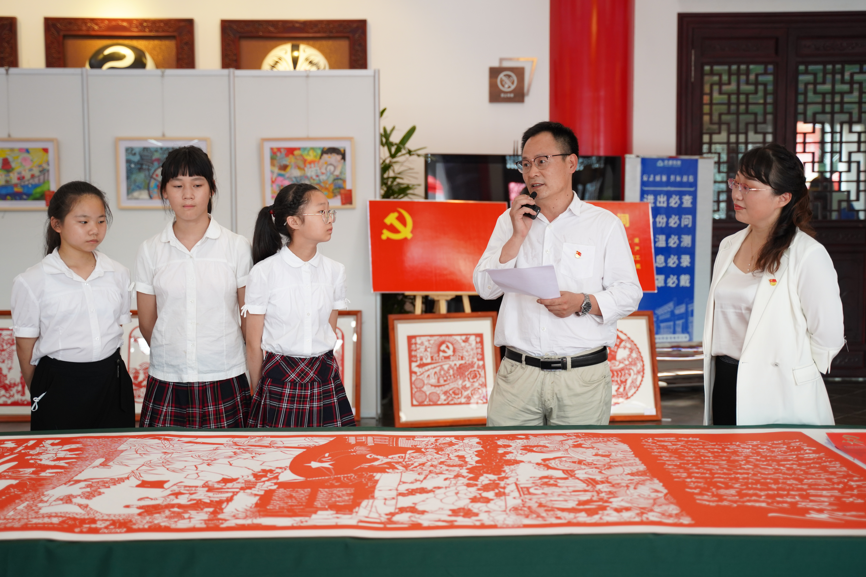 活动中,薛峰小学的师生代表以薛峰小学的剪纸作品——《初心》中呈现的十二个重大历史事件为宣讲材料,声情并茂地带领现场党员群众回顾了我党带领全国各族人民波澜壮阔的光辉奋斗历程。