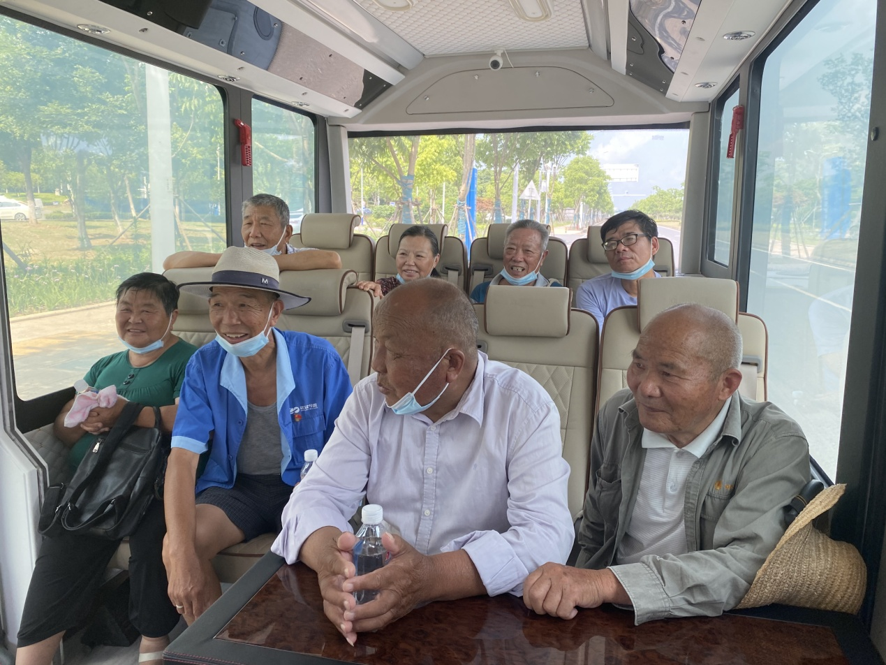 来到龙灵山自动驾驶区,一行人分别坐上3台小巴士,在阿尔法巴自动驾驶公交上,老党员们露出了幸福的笑容。