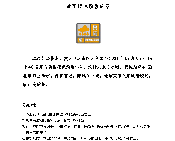 车谷融媒7月5日讯 武汉经开区(汉南区)气象台15时46分发布暴雨橙色预警信号:预计未来3小时,我区局部有50毫米以上降水,伴有雷电,阵风7-9级,地质灾害气象风险较高,请注意防范。 来源:武汉经济技术开发区(汉南区)气象台 6