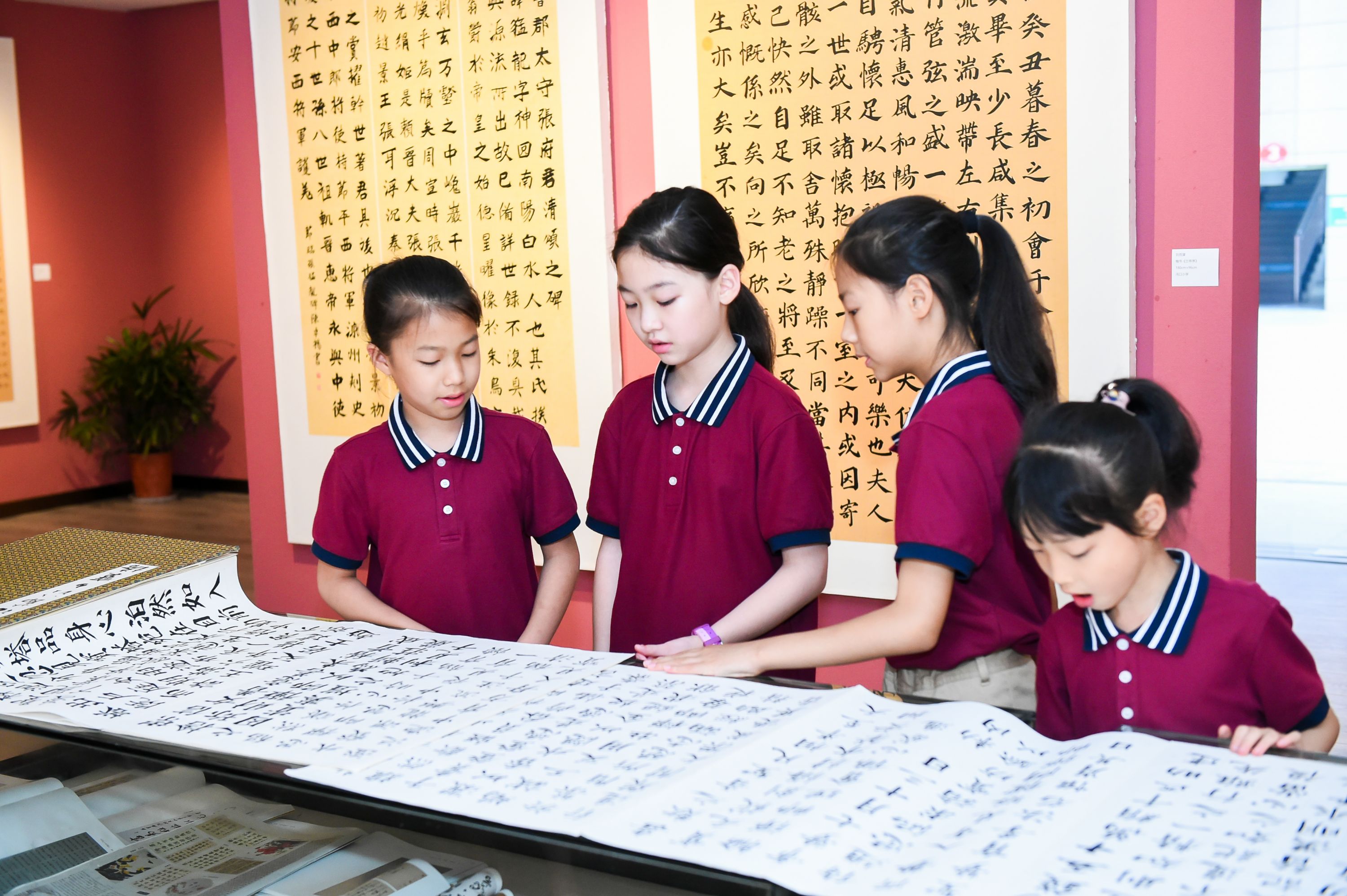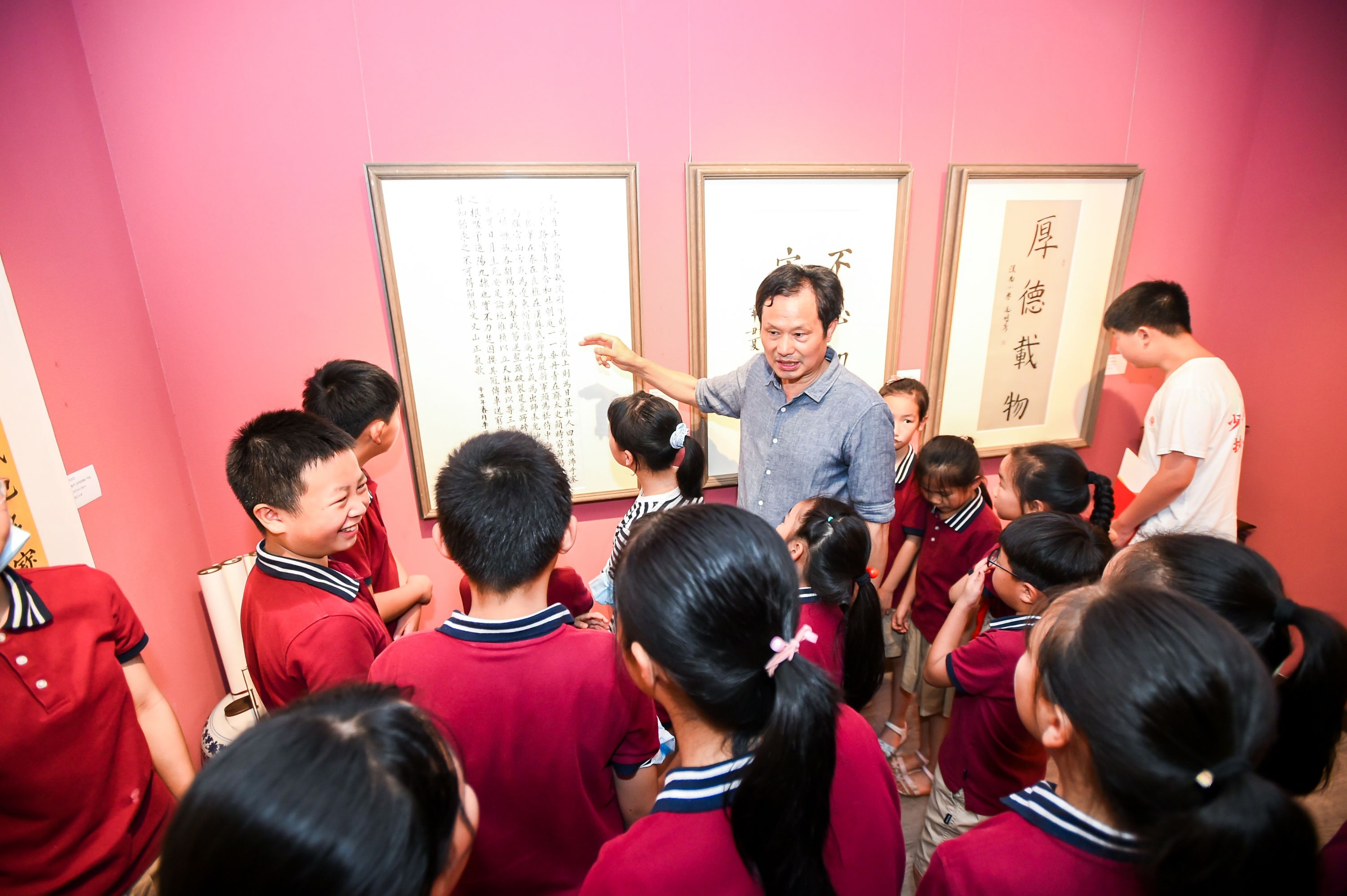 孩子们怀着对传统艺术的敬意,以纸为媒,以墨为法,用最本真的书画语言记录小学的生活,用少年之语诉说成长。其中,由童梦妍、唐睿妍、黄心玥、葛文悦、蔡丰蔚五位同学撰写的折页书法作品被同美术馆永久收藏。湖北省国画院专职画家(原沌口小学副校长)朱德勇带领师生一边观展一边讲解。