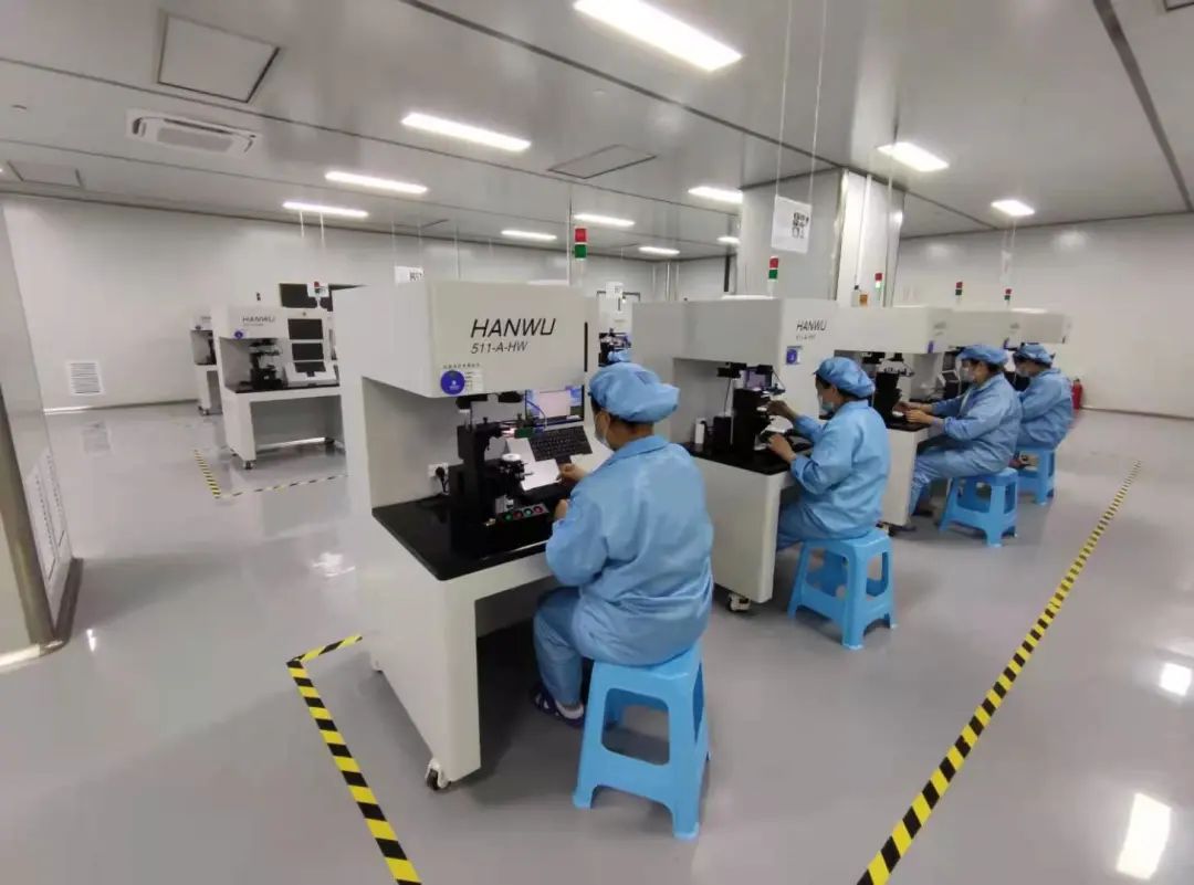 在茂德科技封装车间,记者看到,崭新的智能生产车间内少有工人,取而代之的是先进的自动化设备。每条产线旁,2到3名工人身着防静电服,佩戴口罩等防护用具,有条不紊地进行上料、搬运等工作。
